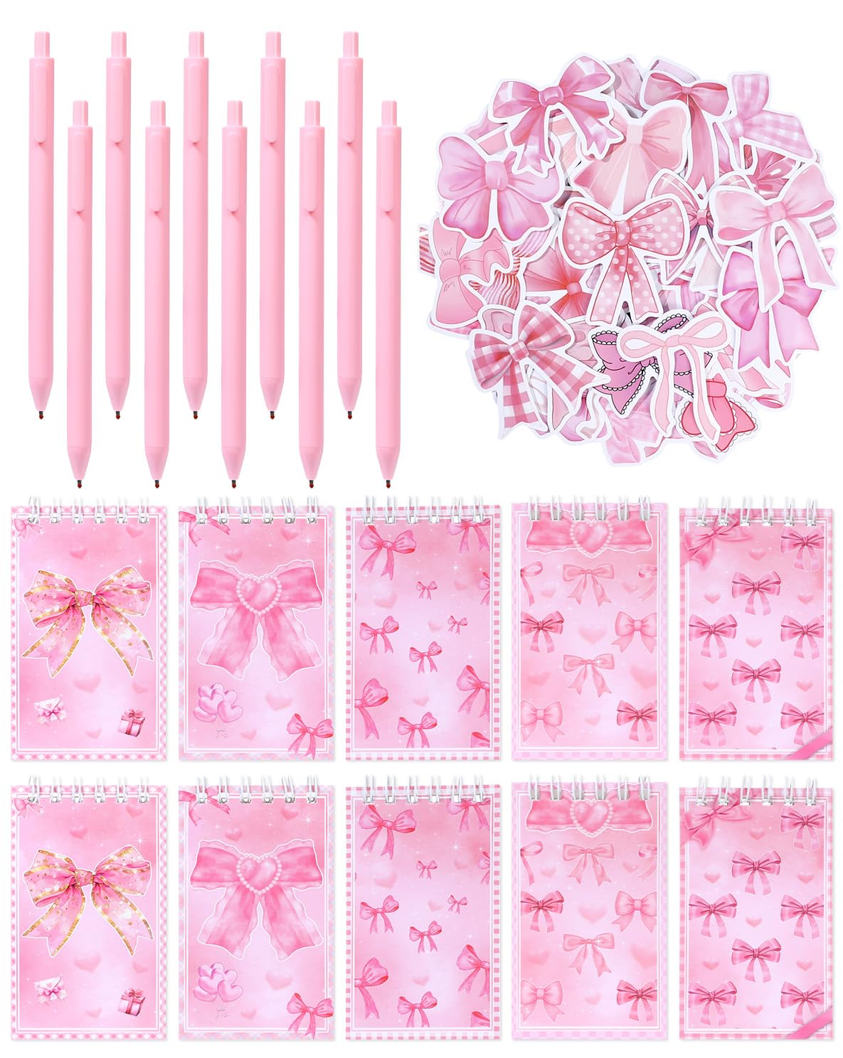 Package Include: You will get 10 pieces mini coquette pink bow notebook, 10 pieces pink ballpoint pens, 103 pieces cute bow stickers, a wide variety of bow party supplies are sure to meet all your expectations for a fun party Cute Bow Theme: This beautiful set of pink bow spiral notebooks paired wit