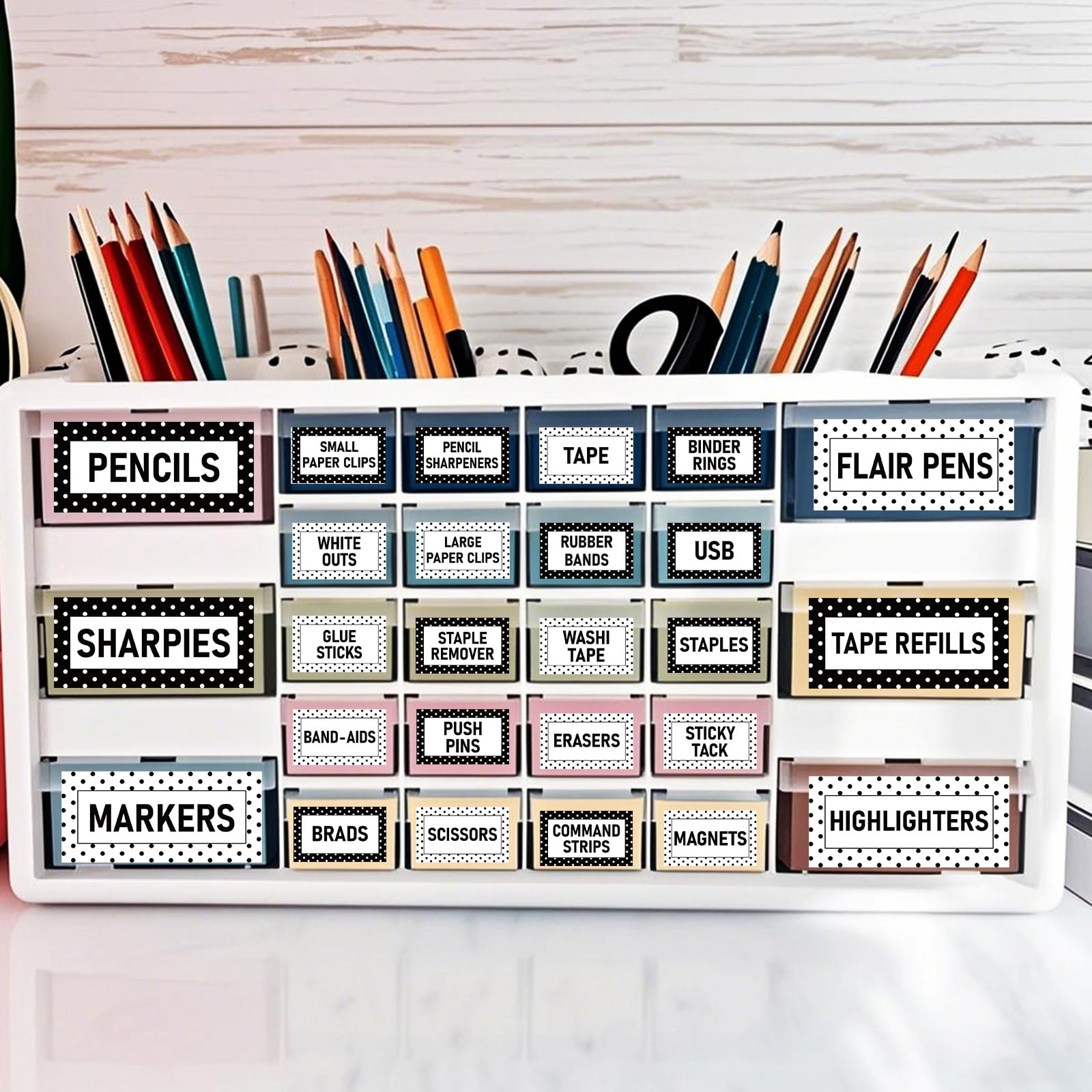 54Pcs Teacher Toolbox Labels Classroom Decoration Self-Adhesive Polka Dot Toolbox Sticker Black White Tool Box Storage Decal Black White Dot Organizer