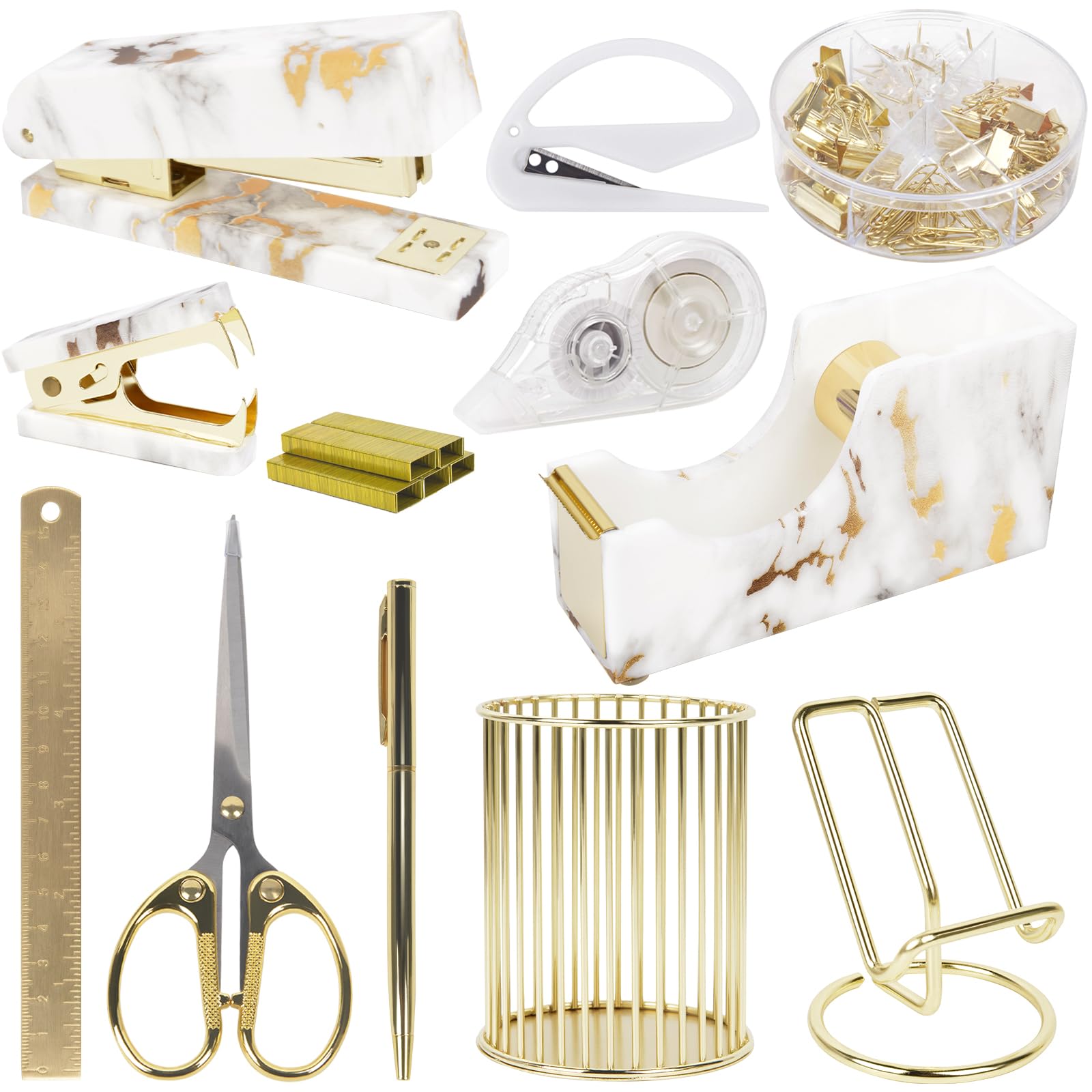 Office Desk Accessories Supplies - 13 Pcs Women Gold Marble Desk Decor Set, Cute Aesthetic Office Essentials Kit, Stapler Tape Dispenser Pen Organizer