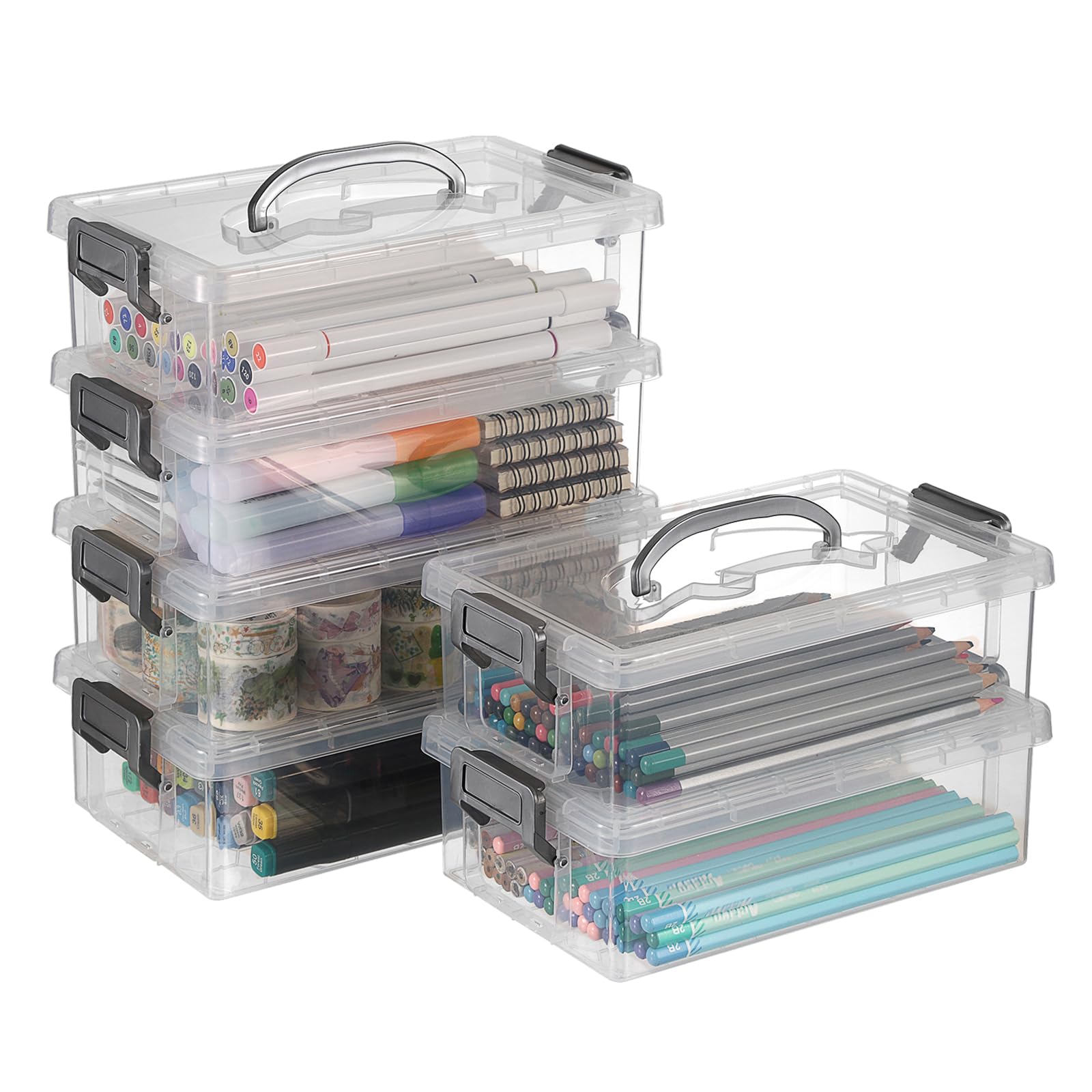 BTSKY 6-Pack Large Stackable Pencil Boxes with Handles, Transparent Pencil Case with Latching Lids & Clasp, Plastic Pencil Box Stationery Organizer