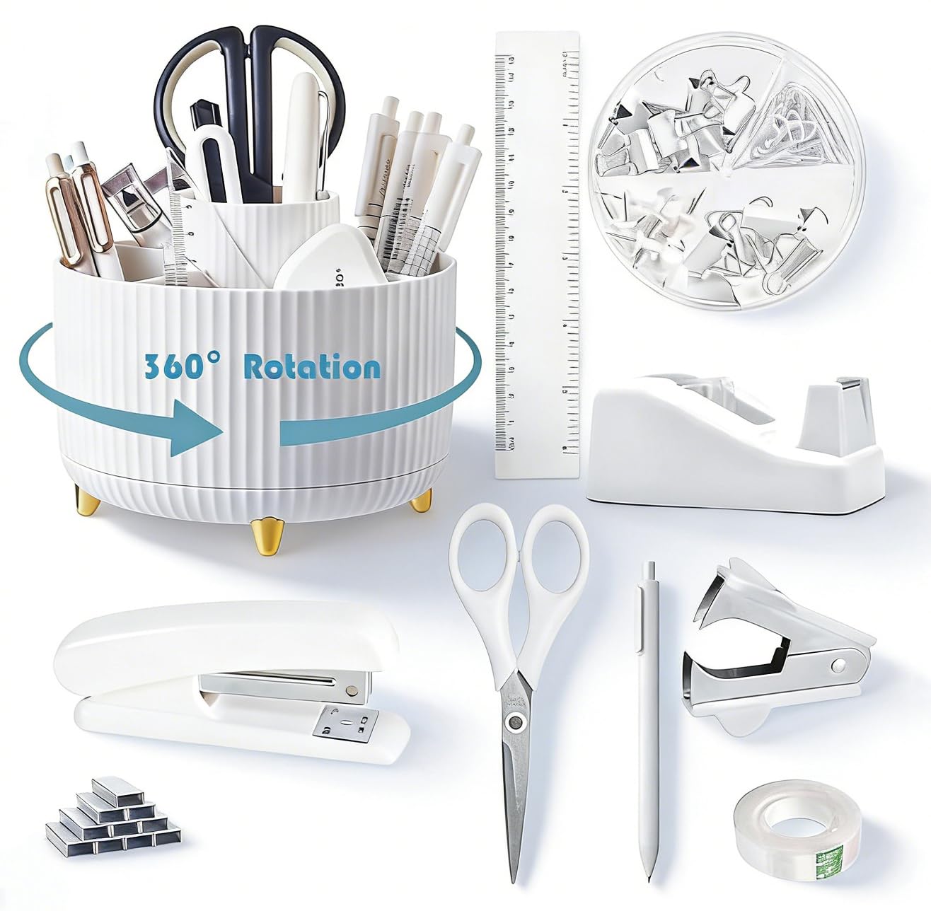 【Packing Listing】: 1 x 360-degree rotating pen holder, 1 x tape holder, 1 x stapler, 1 x scissor, 1 x staple remover, 1 x box of binder clips, 1000 x staples, 1 x Pen, 1 x Tape, 1 x Ruler; This white office set is rich in content and perfect for your desk, improving your productivity and making