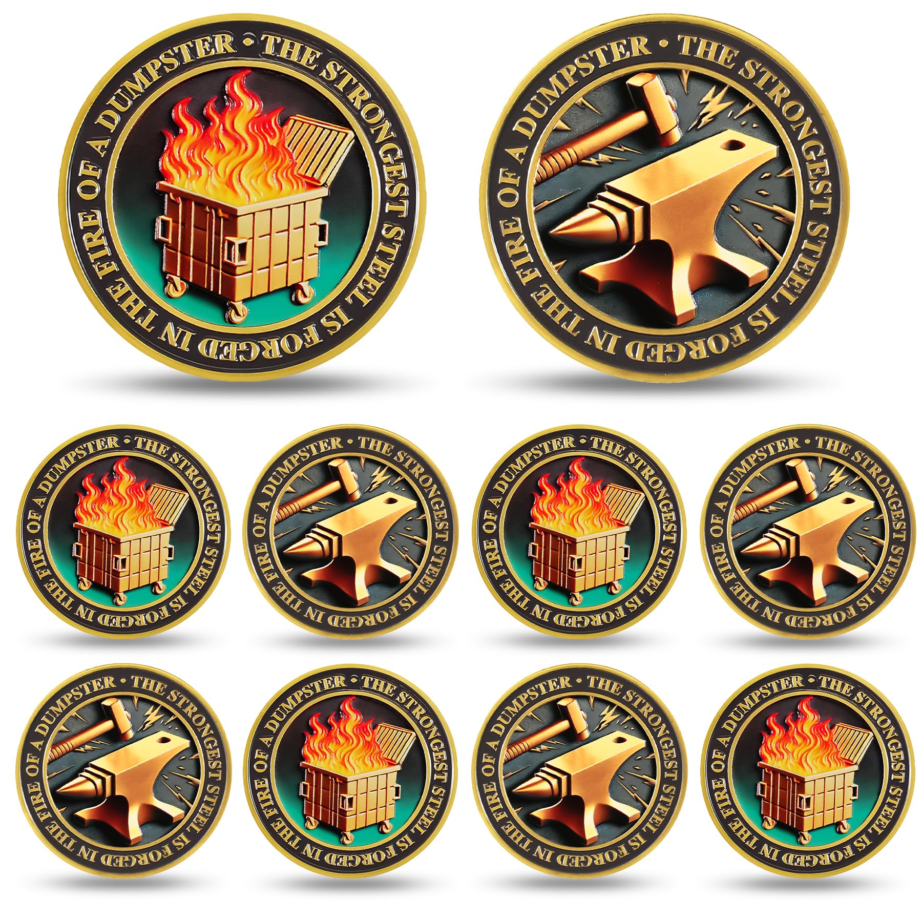 🔥Dumpster Fire: Dumpster Fire Coin features a finely detailed engraving of a dumpster fire, with the chaotic flames symbolizing the forging of the strongest steel. The Dumpster Fire Challenge Coin humorously reminds us that those who endure turmoil and challenges become more resilient and strong