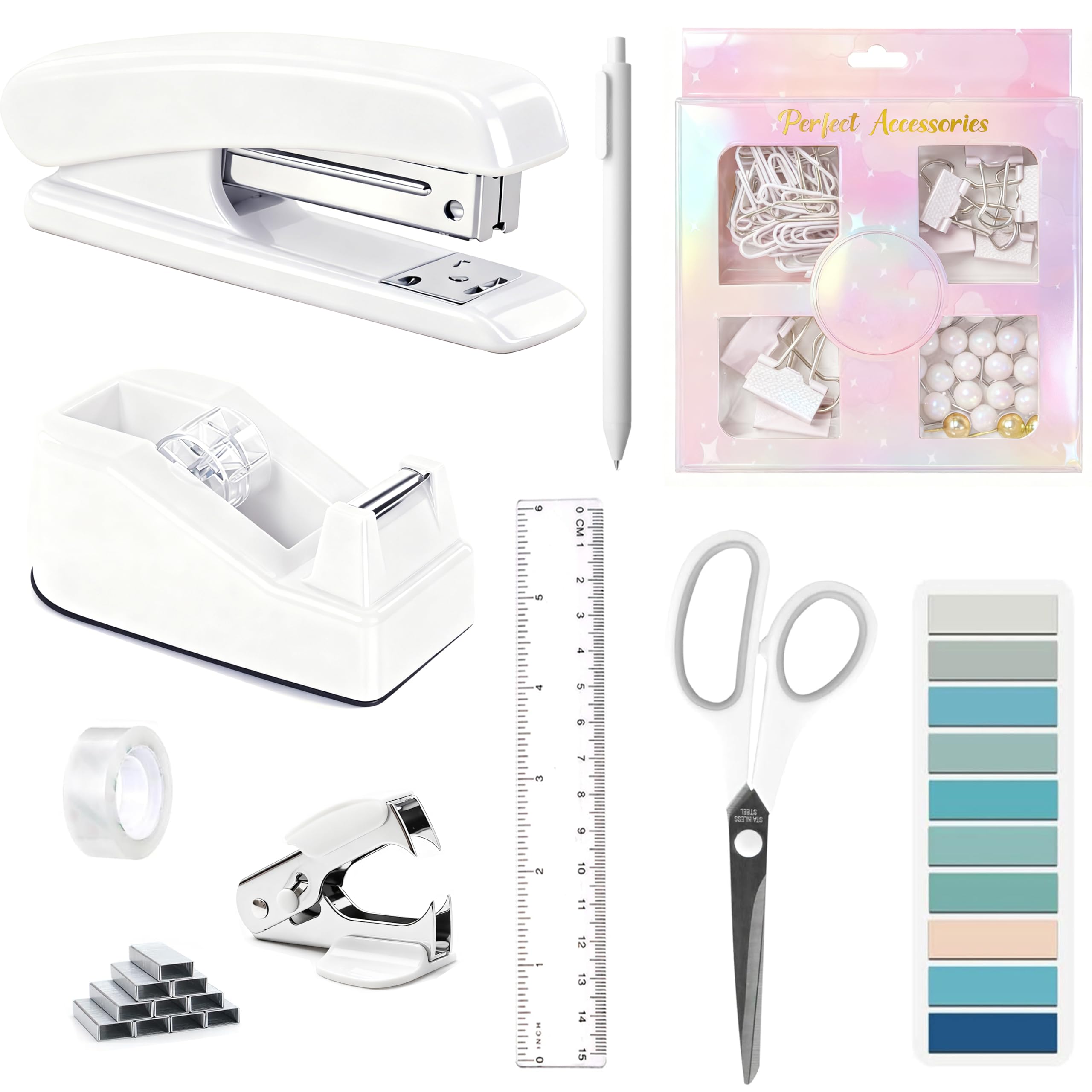 【Package Includes】9pc white office supplies for desk includes 1 Tape Dispenser, 1 Stapler, 1 Staple Remover, 1000 Staples, 1 Tape, 1 cute 4-grid Clips Set(including 30 paper clips, 7 large binder clips, 15 small binder binders, 20 thumbtacks), 1 Ruler, 1 Scissor, 1 Ballpoint Pen. Our office acce