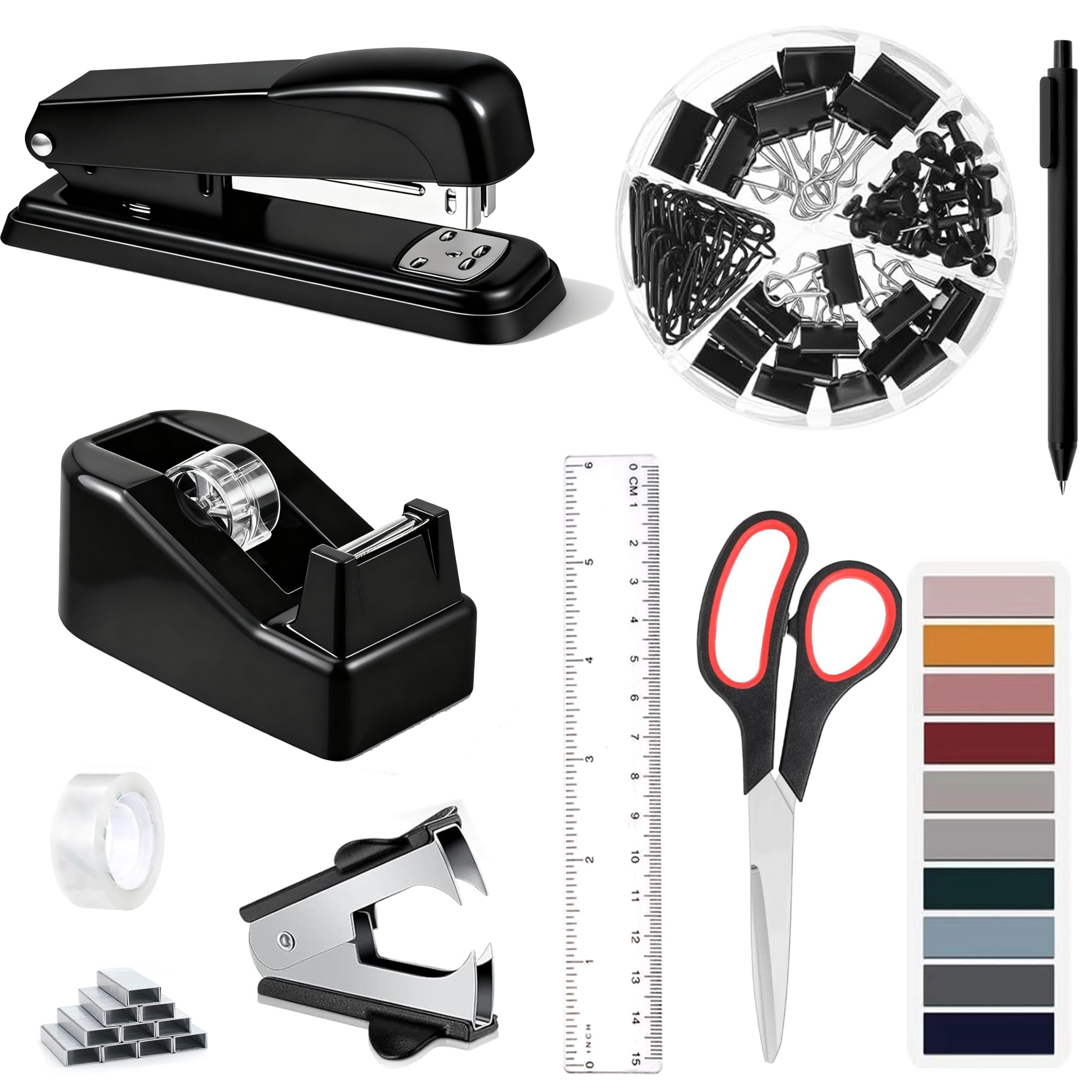 【Package Includes】9pc black office supplies for desk includes 1 Tape Dispenser, 1 Stapler, 1 Staple Remover, 1000 Staples, 1 Tape, 1 cute 4-grid Clips Set(including 30 paper clips, 7 large binder clips, 15 small binder binders, 20 thumbtacks), 1 Ruler, 1 Scissor, 1 Ballpoint Pen. Our office acce