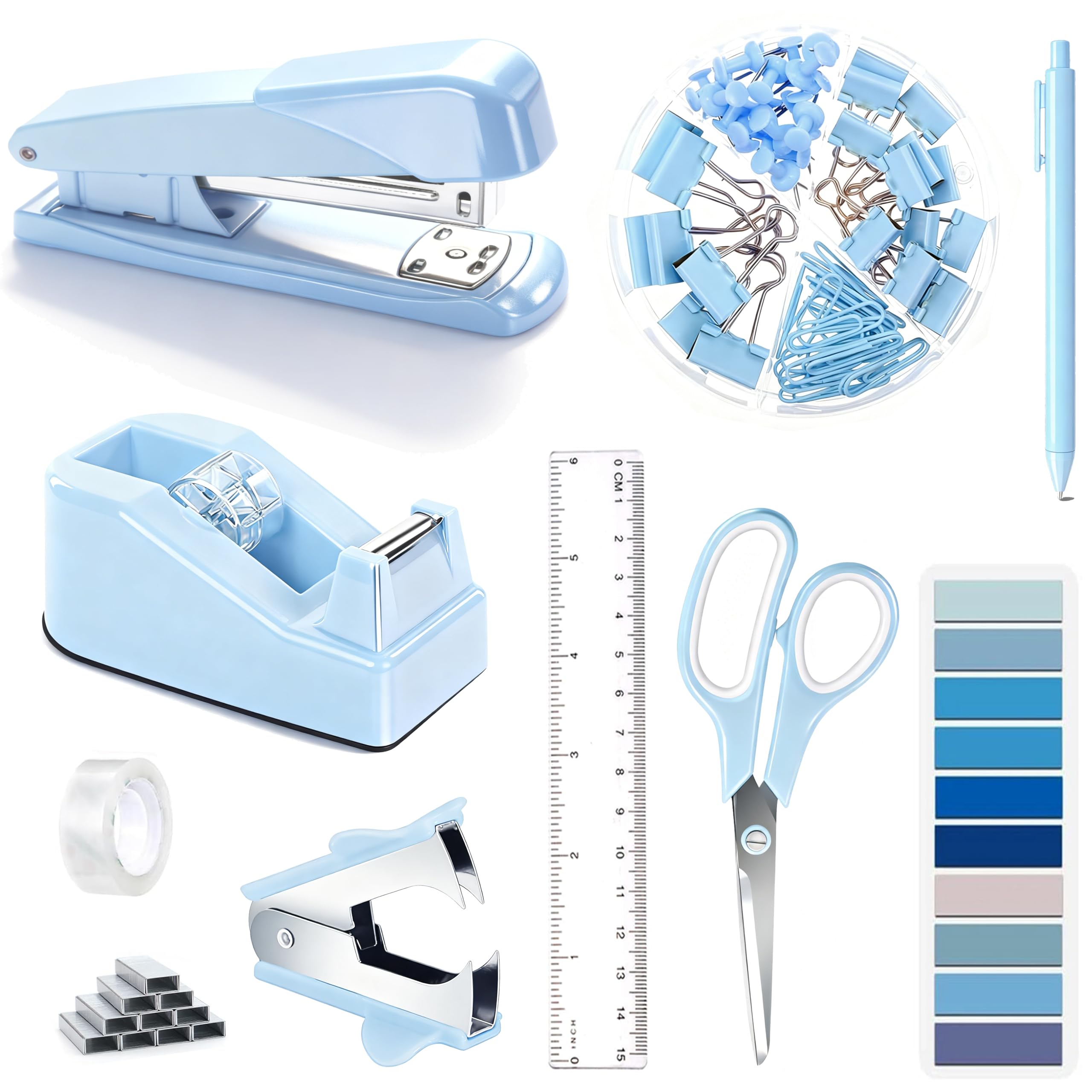 【Package Includes】9pc blue office supplies for desk includes 1 Tape Dispenser, 1 Stapler, 1 Staple Remover, 1000 Staples, 1 Tape, 1 cute 4-grid Clips Set(including 30 paper clips, 7 large binder clips, 15 small binder binders, 20 thumbtacks), 1 Ruler, 1 Scissor, 1 Ballpoint Pen. Our office acces