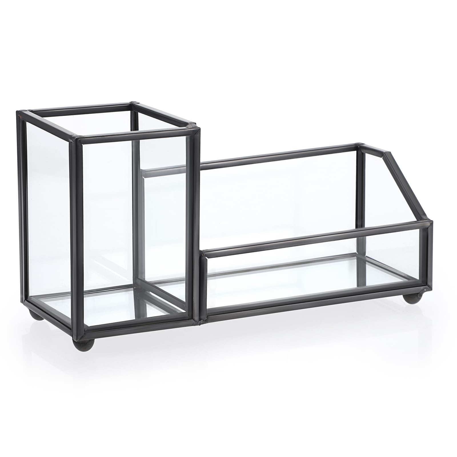 Hipiwe Glass Business Card Holder Metal Pen Pencil Storage Holder for Desk Clear Business Card Display Organizer Case for Office Home,2 Slots,Black