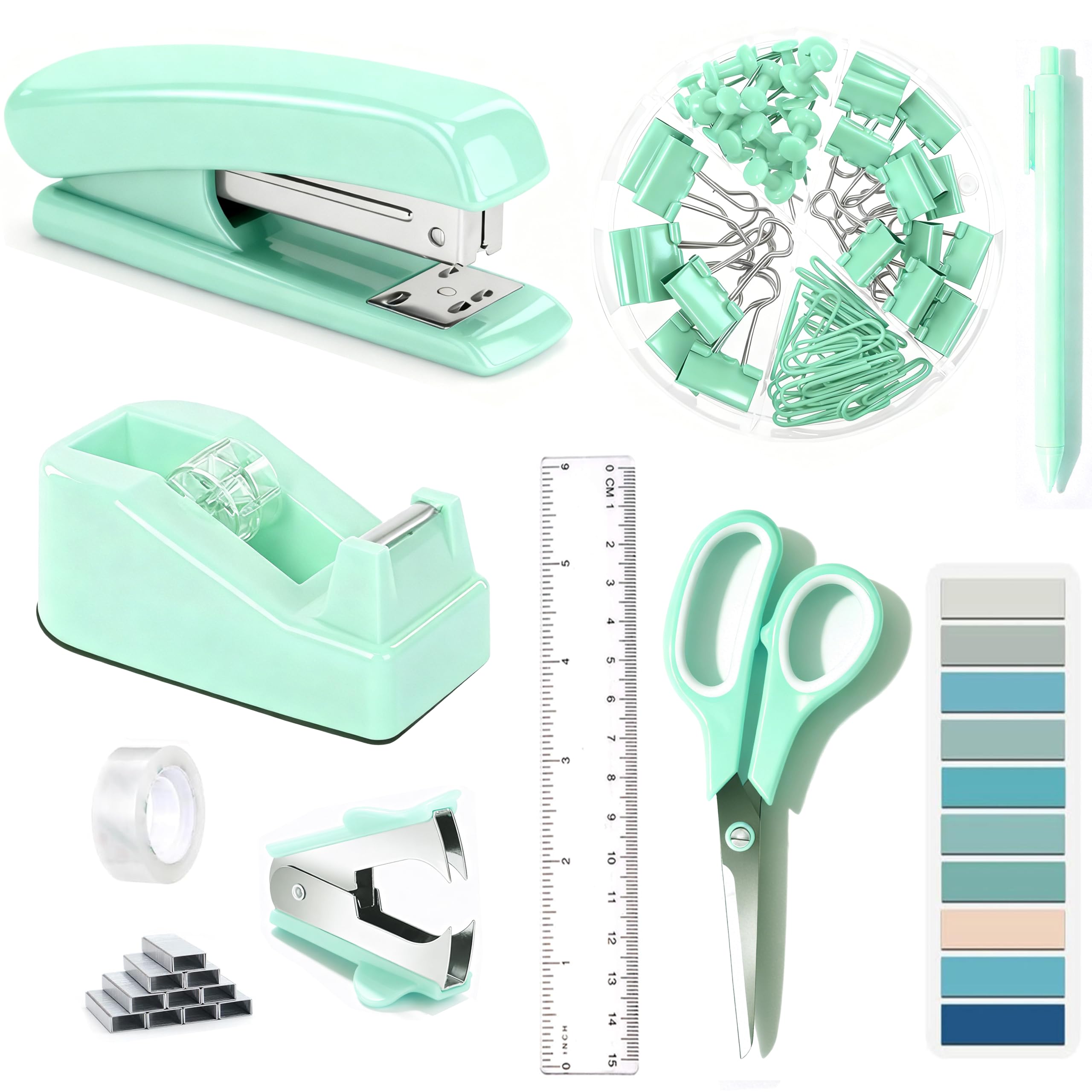 Dimonluce Green Office Supplies, Teal Desk Accessories Accessories with Tape Dispenser, Stapler, Staple Remover, 1000 Staples, Tape, Clips Set, Ruler,