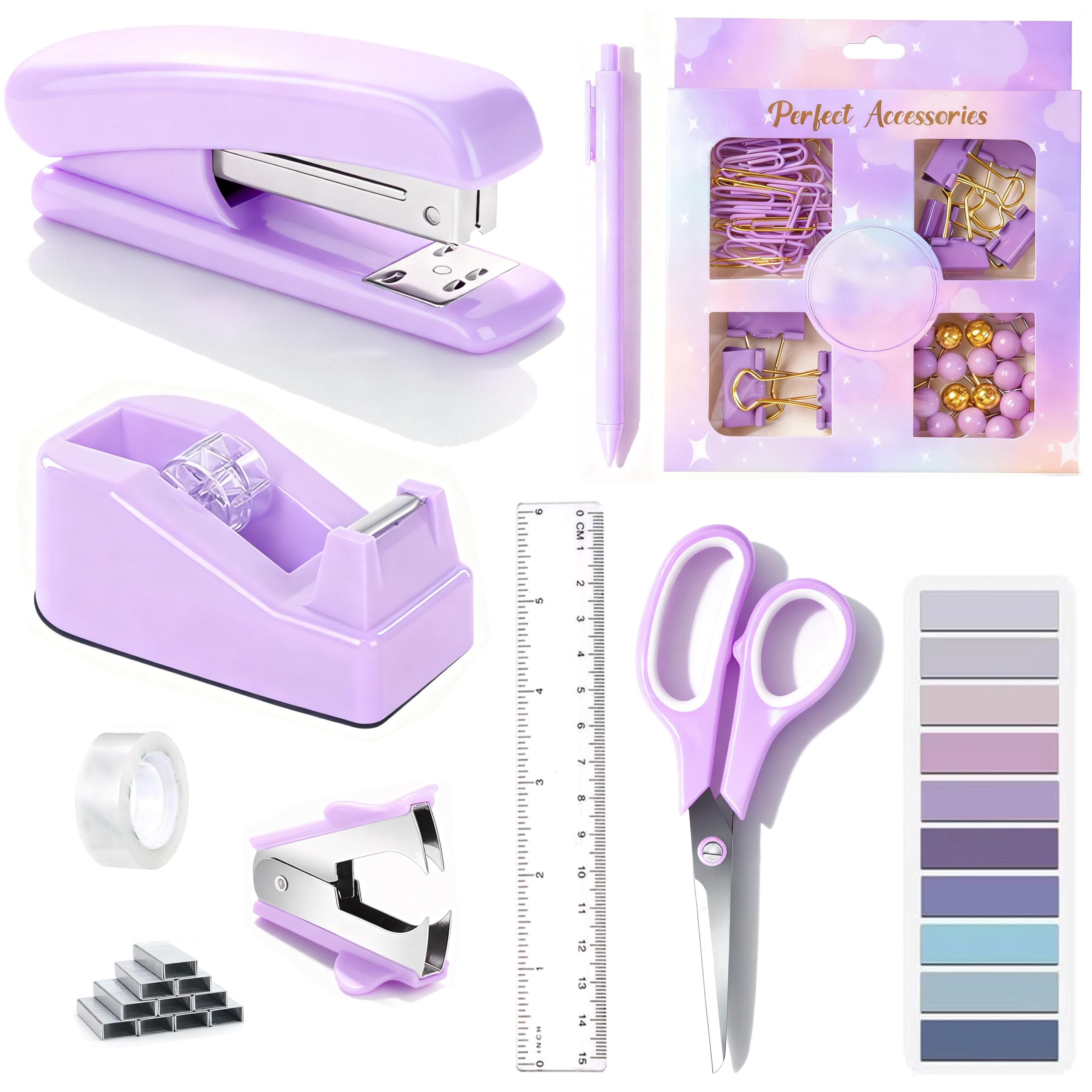 【Package Includes】9pc purple office supplies for desk includes 1 Tape Dispenser, 1 Stapler, 1 Staple Remover, 1000 Staples, 1 Tape, 1 cute 4-grid Clips Set(including 30 paper clips, 7 large binder clips, 15 small binder binders, 20 thumbtacks), 1 Ruler, 1 Scissor, 1 Ballpoint Pen. Our office acc