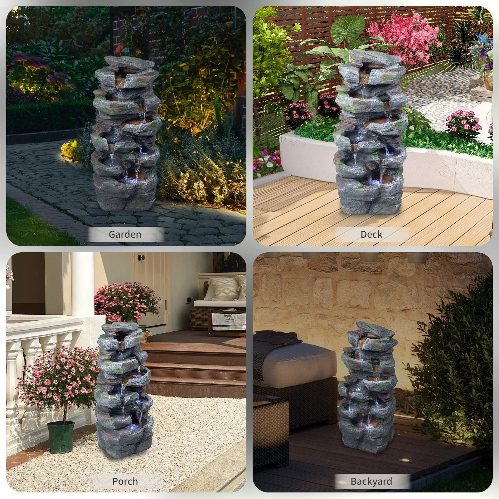 Product Features 💎 Natural Rock Waterfall Design This outdoor fountain features a realistic stone texture, adding natural charm and elegant decoration to your patio, lawn, backyard, or garden, creating a tranquil and pleasant outdoor atmosphere