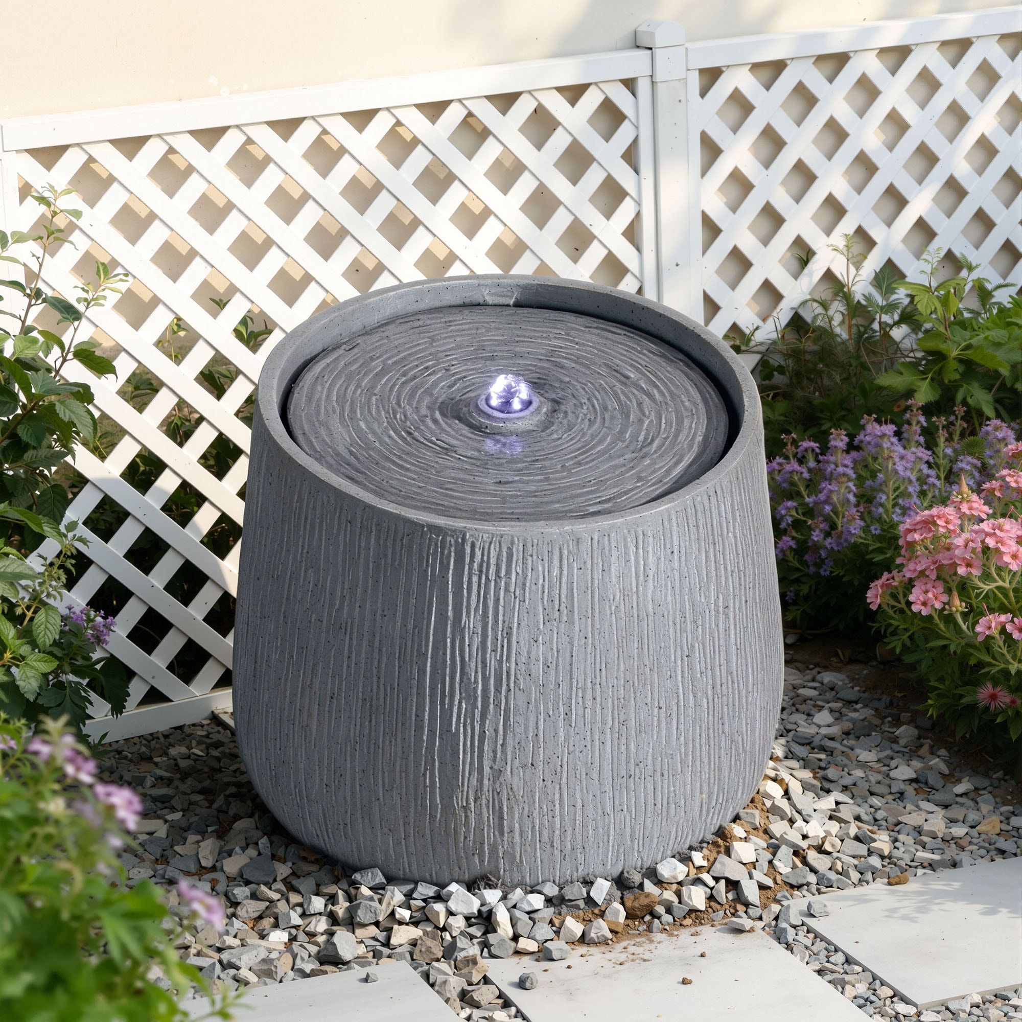 Create a calming retreat with this 12.99-inch gray bowl-shaped outdoor water fountain. Featuring a gentle bubbling flow and built-in LED illumination, it delivers tranquil sound and ambient lighting in a compact design.