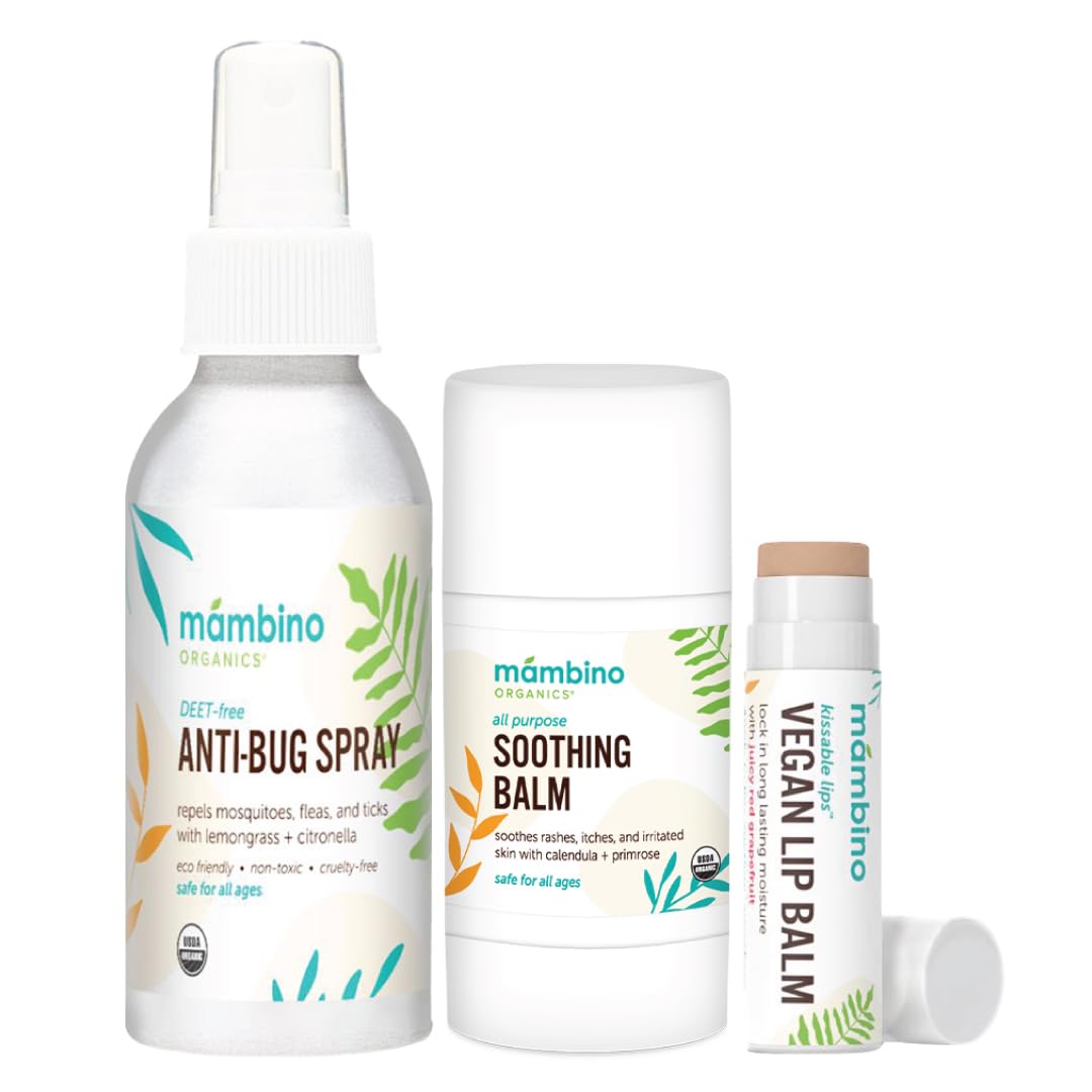 Mambino Organics Outdoor Set, DEET-Free Anti-Bug Spray, Soothing Balm, Vegan Lip Balm, Organic Ingredients, No Animal Testing, 4 fl oz