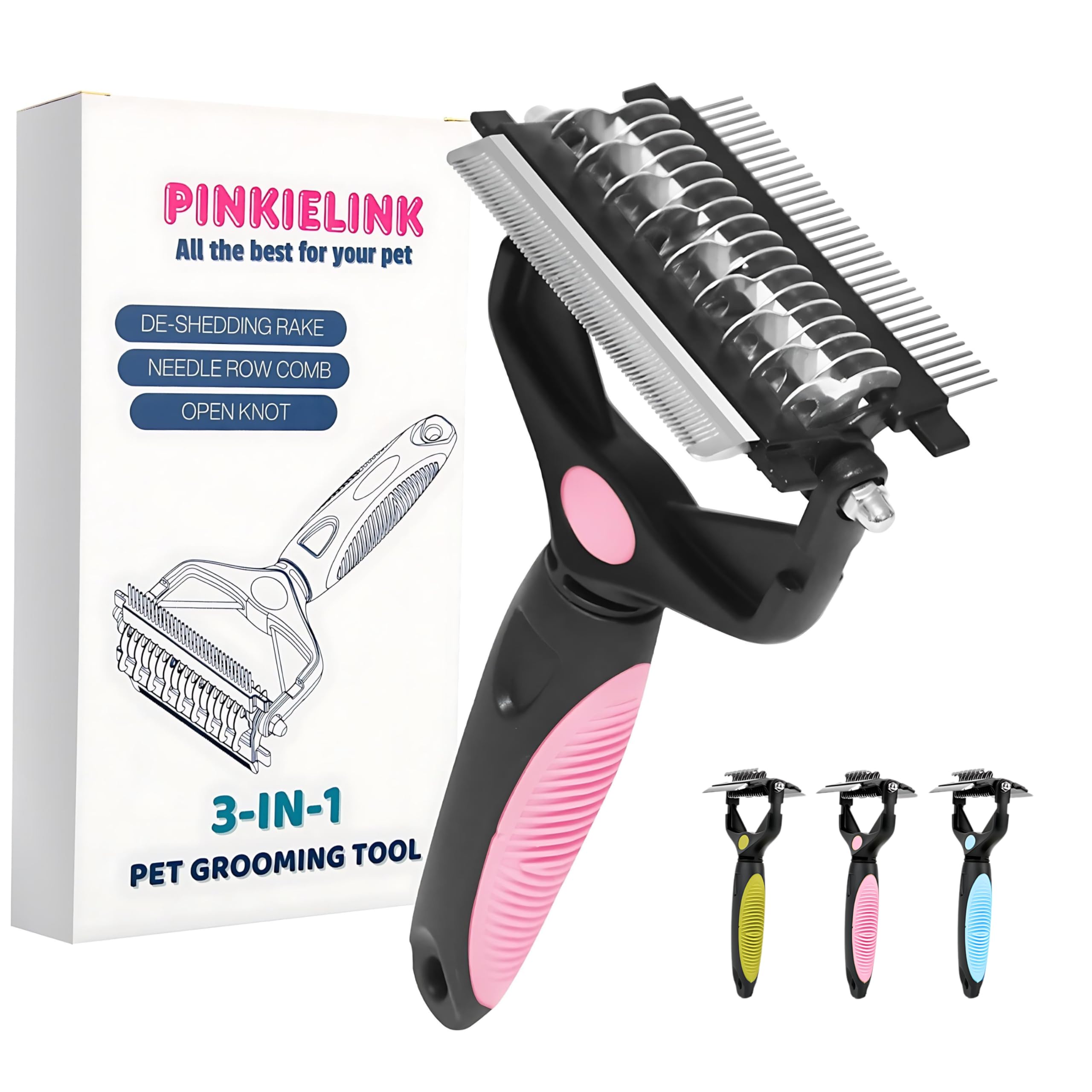 PINKIELINK 3-IN-1 Pet Grooming Tool - Undercoat Rake, Dematting Comb & Deshedding Brush for Cats & Dogs - Removes Mats, Tangles & Loose Fur, Reduces