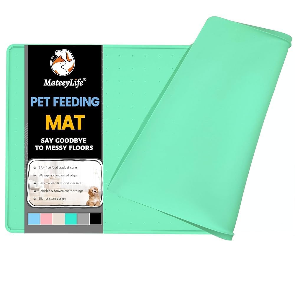 MateeyLife Dog & Cat Food Mat - Waterproof, Nonslip, Raised Edges, Silicone Tray for Messy Drinkers, 24"x16", Mint Green