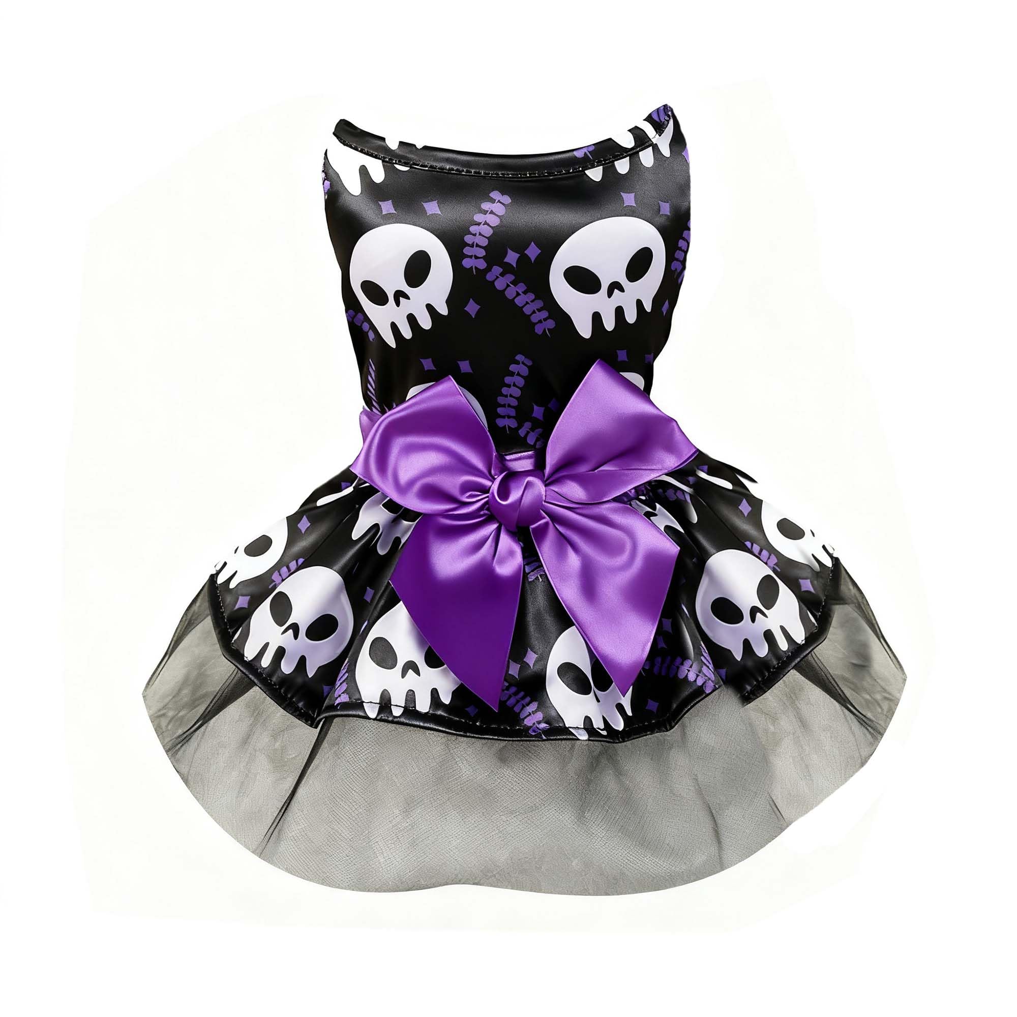 Exclusive Style: Allover signature Halloween color with this dress and filled with skulls and an elegant purple bowknot on the waist. Stunning and cute, this would be your pet's best Halloween dress ever. Comfortable Material: This Halloween pet clothing is made of soft fabric that does not irritate