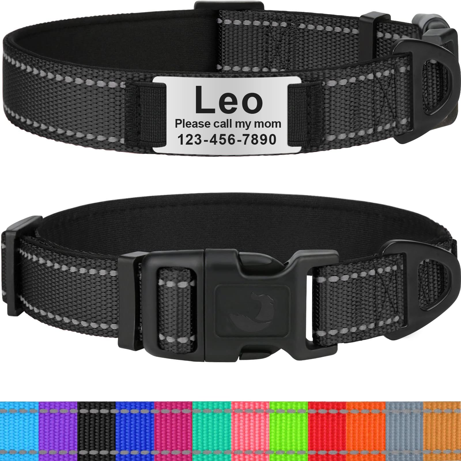 Taglory Personalized Dog Collars for Puppy Dogs, Custom Reflective Collar with Name Plate, Padded Pet ID Tags with Engraved Slide, Black