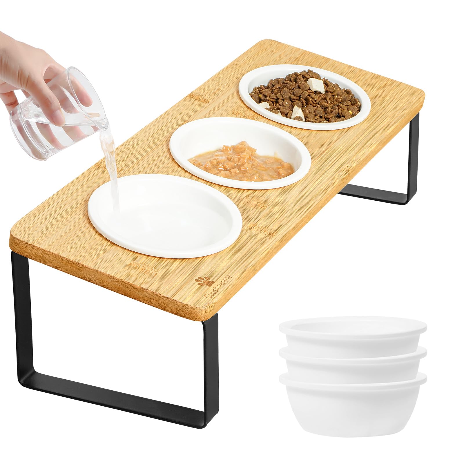 Sunhoo Elevated Cat Bowls for Indoor Cats Raised Tilted Food Water Kitty Dish Stand with 6 Ceramic Bowl Set Orthopedic Wooden Pet Feeder Feeding