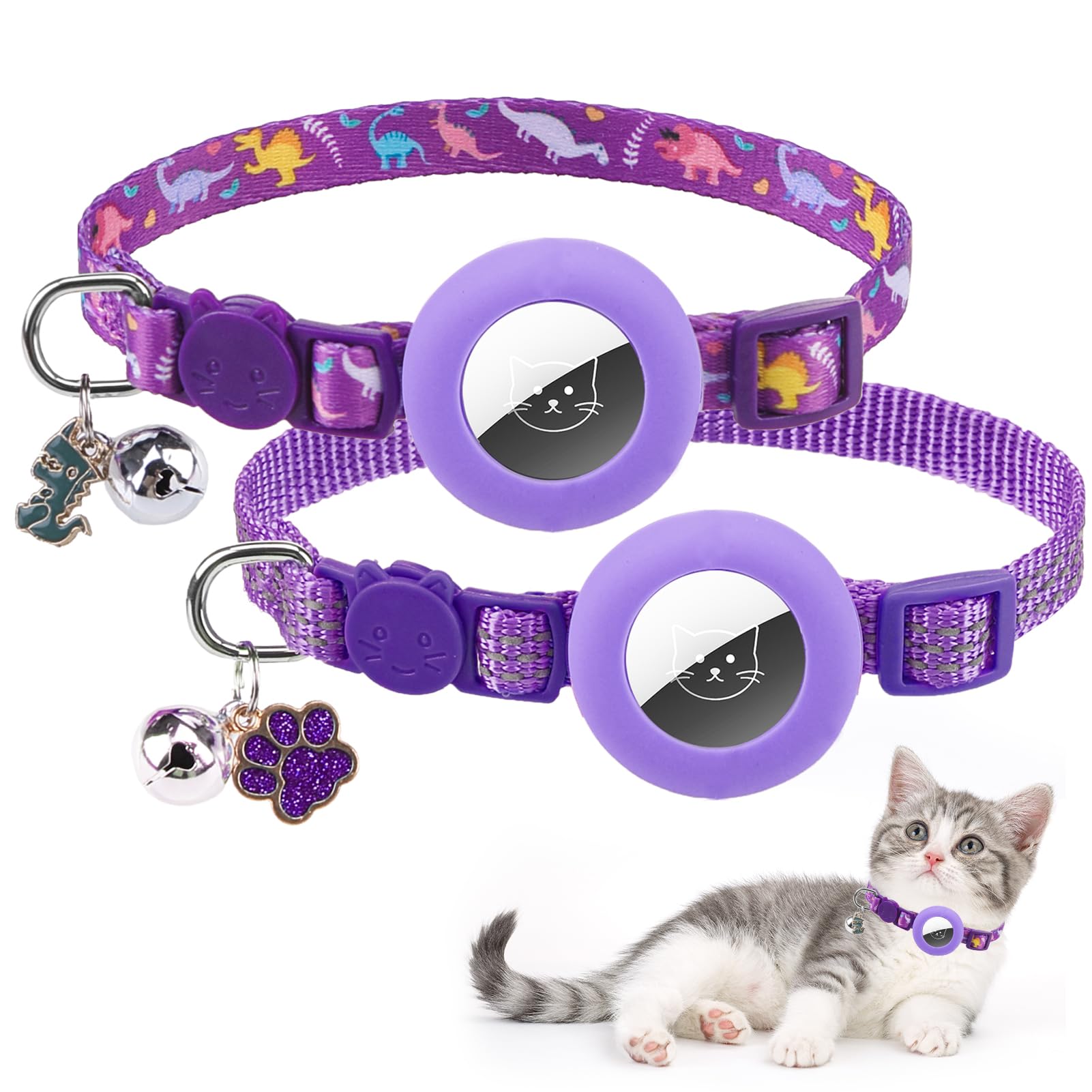 PUPTECK Airtag Cat Collar Breakaway 2 Pack with Bells, Reflective Kitten Collar with Air Tag Holder for Boy Girl Kitty and Puppies, Soft, Purple