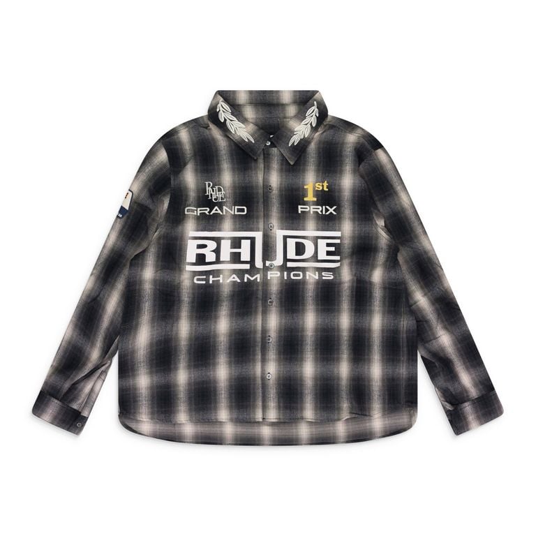 Men's Rhude Racing Flannel - Gray - Casual shirts Rhude Men's Racing Flannel Highlights Black Plaid pattern Embroidered logo to the front Front button fastening Classic collar Long sleeves Buttoned cuffs Curved hem Material Composition - 100% Silk...