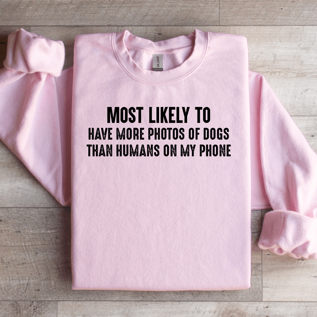 Celebrate your love for dogs and a good sense of humor with the Most Likely To Have More Photos Of Dogs Sweatshirt. This womens statement sweatshirt is perfect for those who know that a picture of a dog is never just a photo its a moment of joy,...
