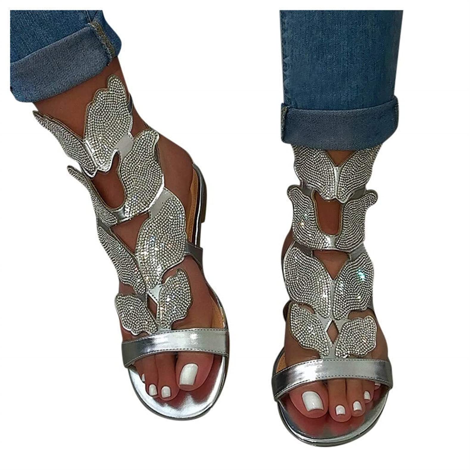 HINDOLA Women's Rhinestone Glitter Flat Sandals Summer Beach Sandal Casual Open Toe Flat Slippers Gladiator Roman Rhinestone Sandals for Women