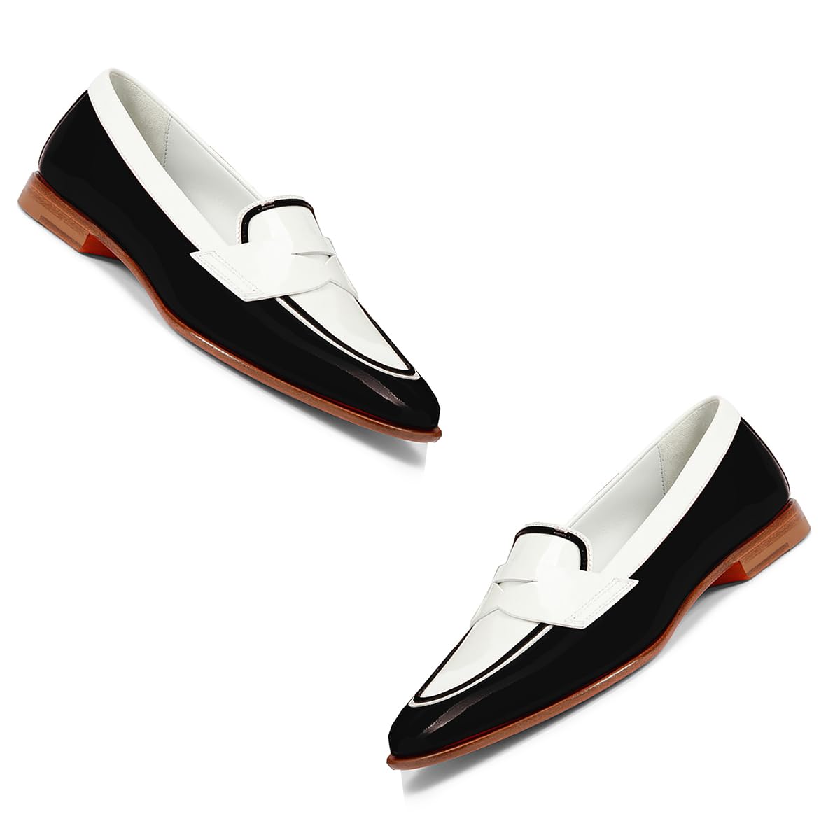1 inch flat heel loafer shoes: 1 inch flat heel loafers dress shoes patent two tone design makes wearing easier and more comfortable, whether standing or walking for a long time, to maintain a comfortable state. The casual round toe slip on loafers flats patent black white can be paired with various