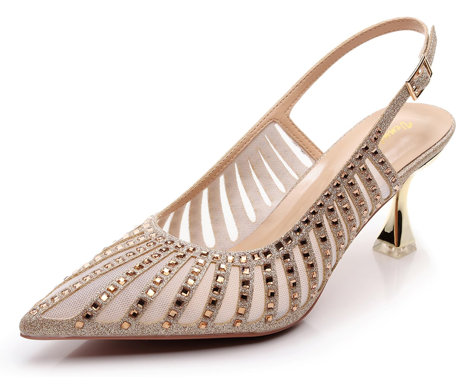 Kitten Heels for Women: Heel height 2.5 inches (6 cm), providing a comfortable yet stylish elevation. Outstanding Features: Pointed toe, sexy kitten heels, slingback strap with buckle, available in solid colors and dusty glitter with hotfix crystals upper for a touch of luxury. Sparkle & Style: The