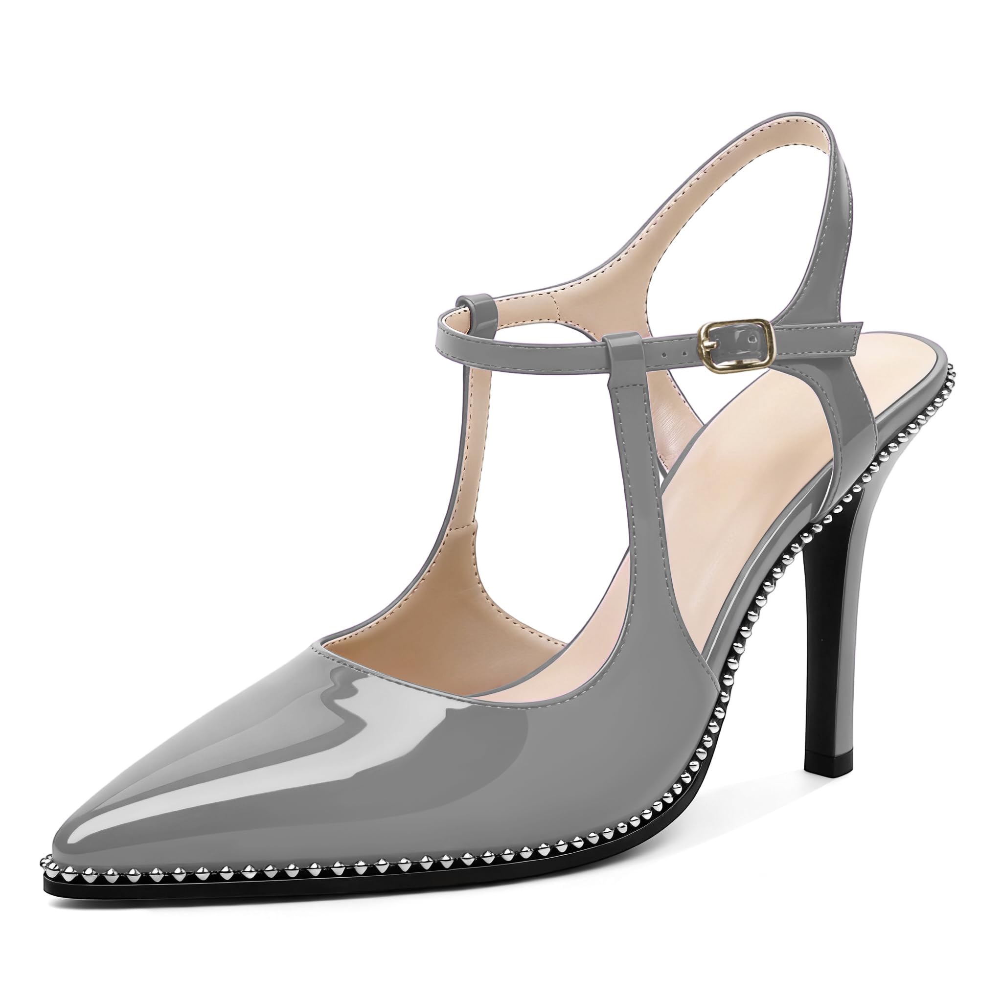 SAMMITOP Womens High Heels Ankle Strap Pointed Toe Stilettos Patent Leather Beaded Pumps Dress Shoes 3.5 Inch