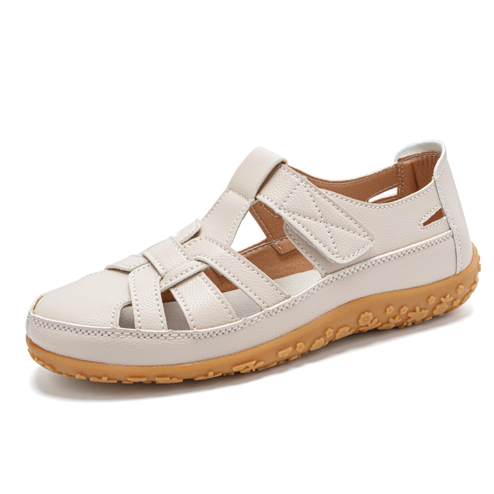 Women's Leather Cutout Flat Loafers Closed Round Toe Adjustable Hook and loop Non-Slip Soft Bottom Beach Sandals Daily Breathable Walking Casuals