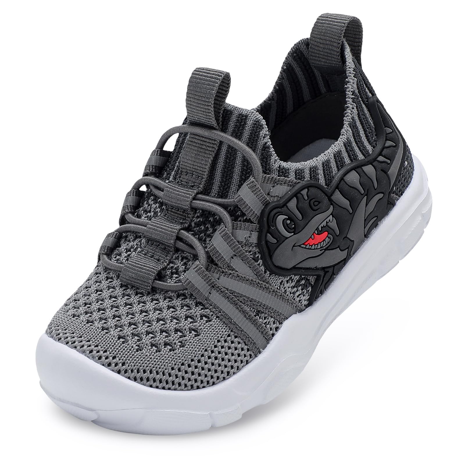 UNIQUE DESIGN: Toddler walking shoes are designed with dinosaurs pattern and safety reflective stripes on the side, which adds a nice touch to them in design. Our toddler sneakers are a cute design of shoes that your kids will definitely happy whether boys or girls KNITTED UPPER: Toddler sneakers up