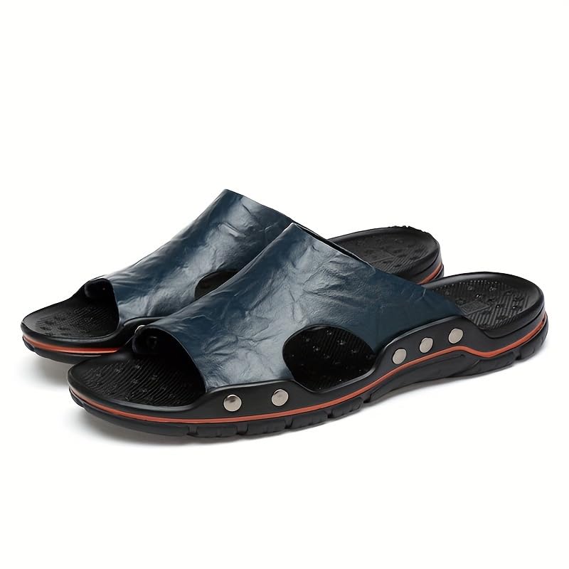 Plus Size Men's Trendy Open Toe Summer Slides with Split Leather Uppers, Wear-Resistant Slip On Beach Slides for Outdoor Walking