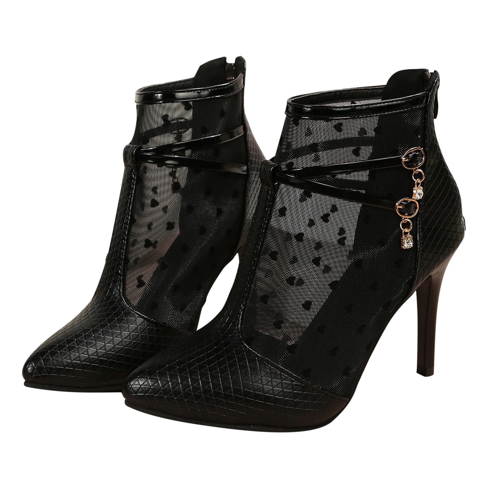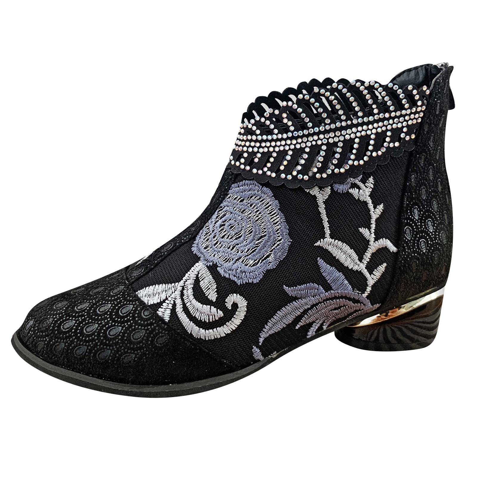 Sparkly Rhinestones Ankle Boots for Women Chunky Heel Vintage Pointed Toe Flower Embroidery Hollow Slip on Mid Heel Booties Retro Casual Ladies Shoes