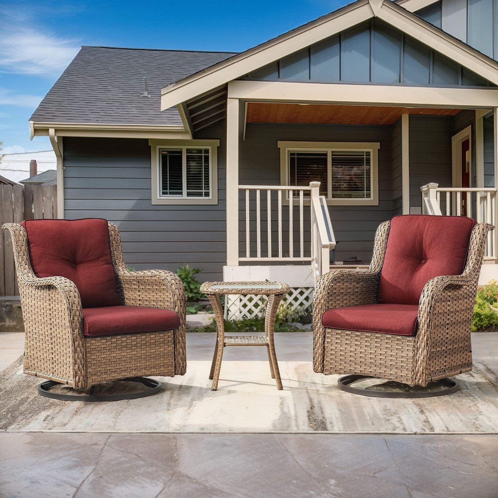 3 Piece Outdoor Patio Set, Wicker Rocking Bistro Set with 2 Swivel Chairs & Tempered Glass Top Table
