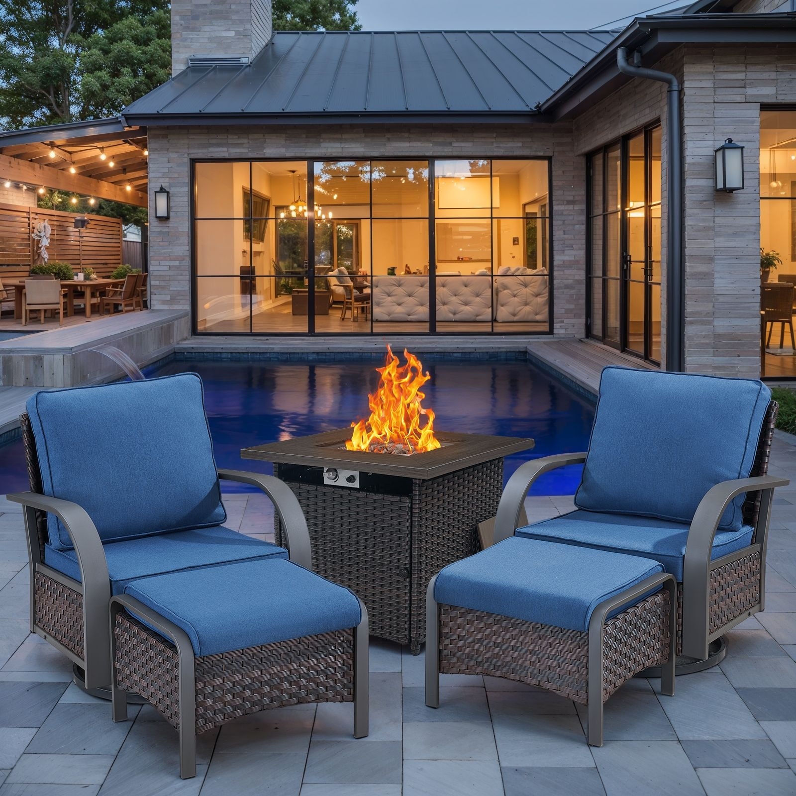 Patio 4Pieces Glider Chairs Ottoman with Fire Pit Table - Blue cushion - Brown