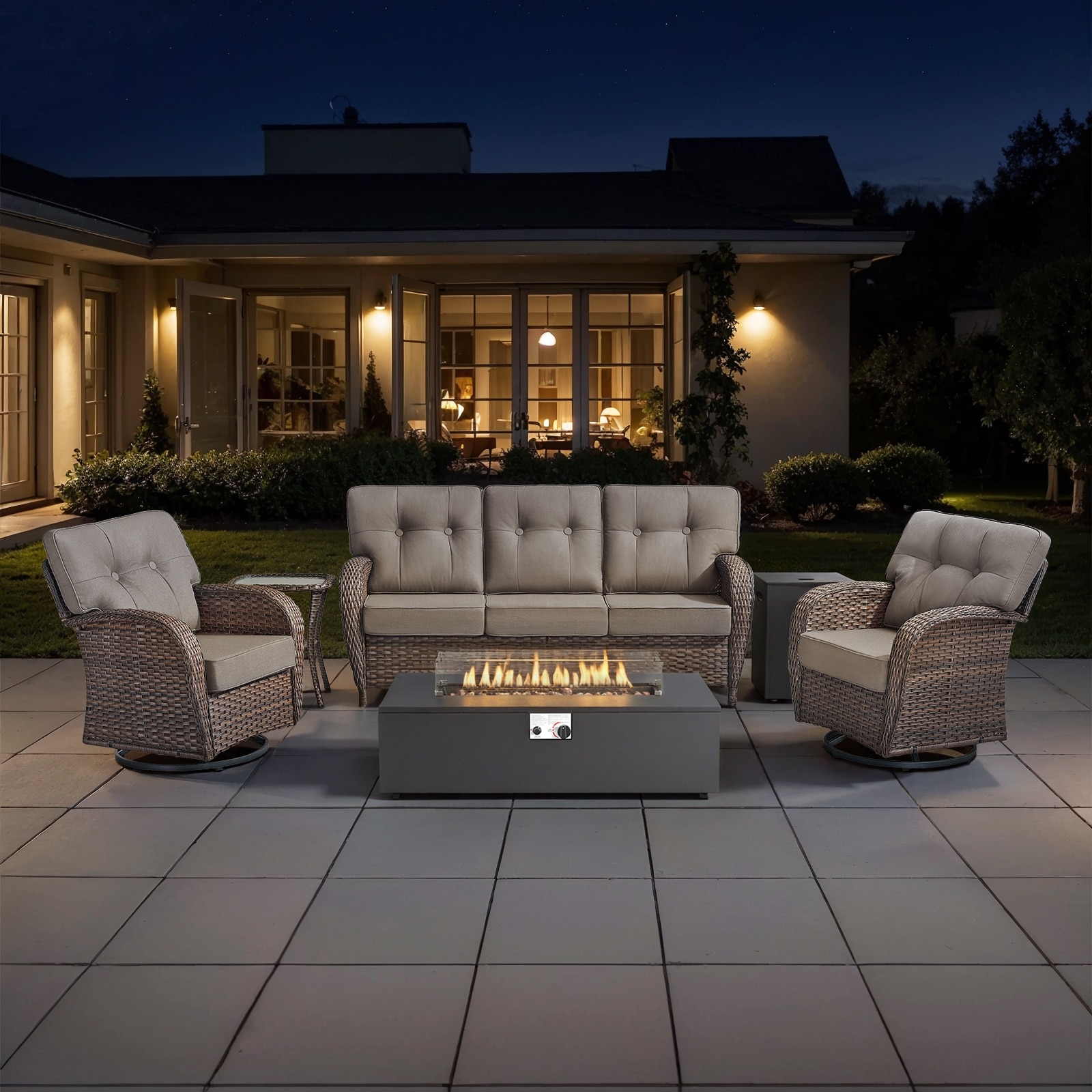 Transform your outdoor space into a luxurious retreat with this Outdoor Wicker Patio Furniture Set! It includes a spacious sofa, 2 swivel chairs,a side table, and a 55,000 BTU propane fire pit table (2 ottomans options provided.)