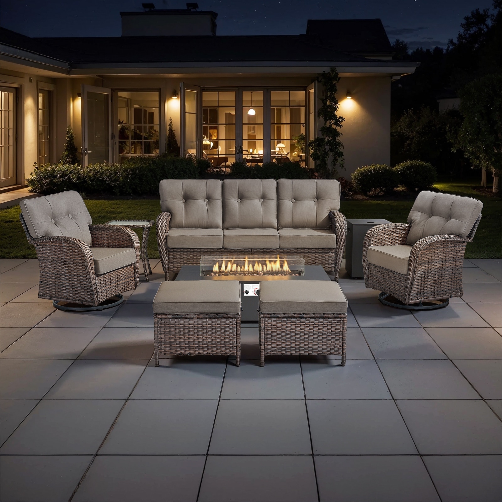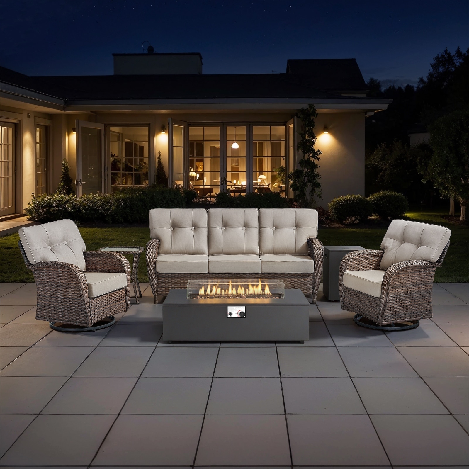 Transform your outdoor space into a luxurious retreat with this Outdoor Wicker Patio Furniture Set! It includes a spacious sofa, 2 swivel chairs,a side table, and a 55,000 BTU propane fire pit table (2 ottomans options provided.)
