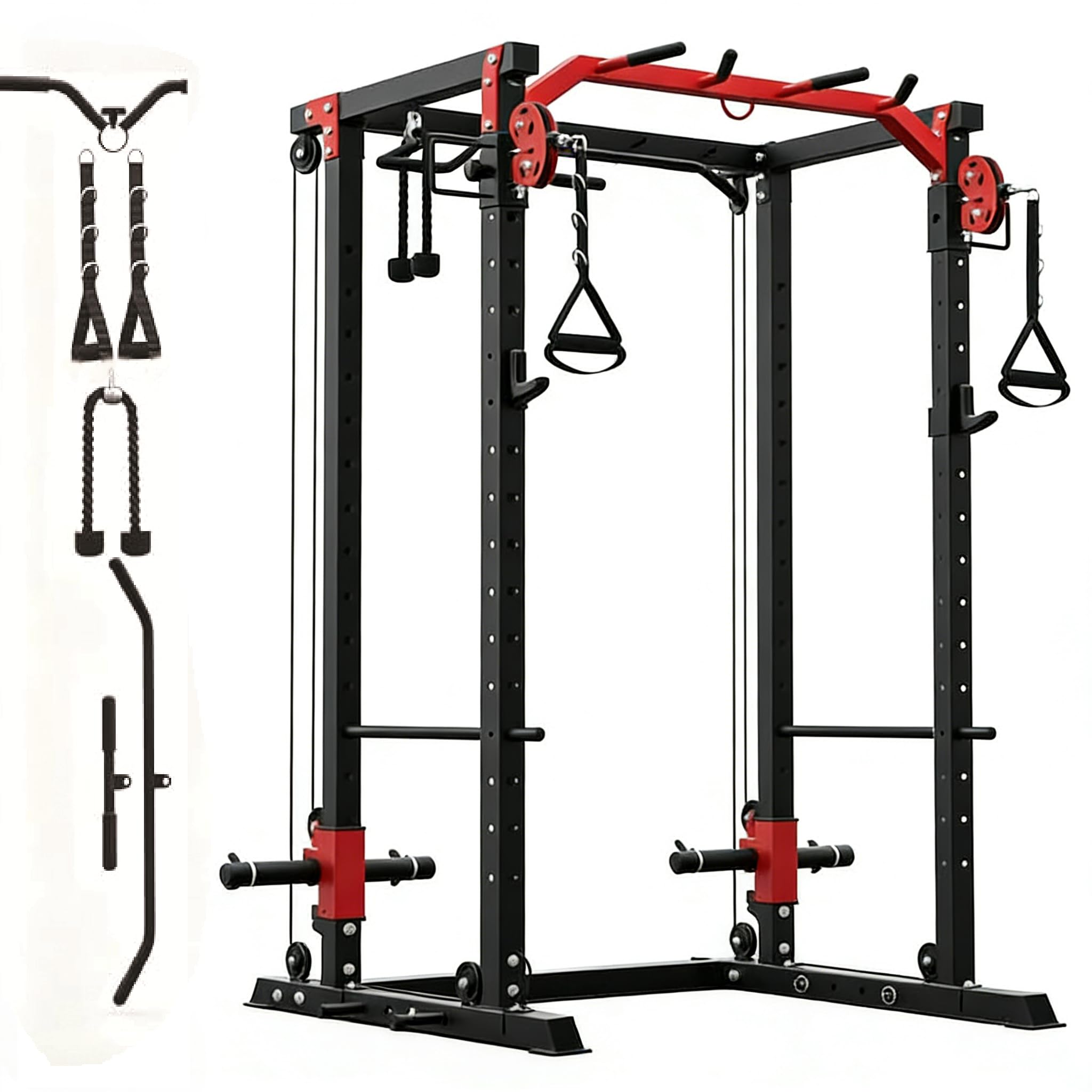 All-In-1 Training Station: This power cage for home integrates a squat rack, pull-up station, cable crossover, and lat pulldown system. It enables diverse exercises like cable fly, bench press, squats, and low rows for a complete home gym solution without switching machines Robust 2000LBS Weight Cap