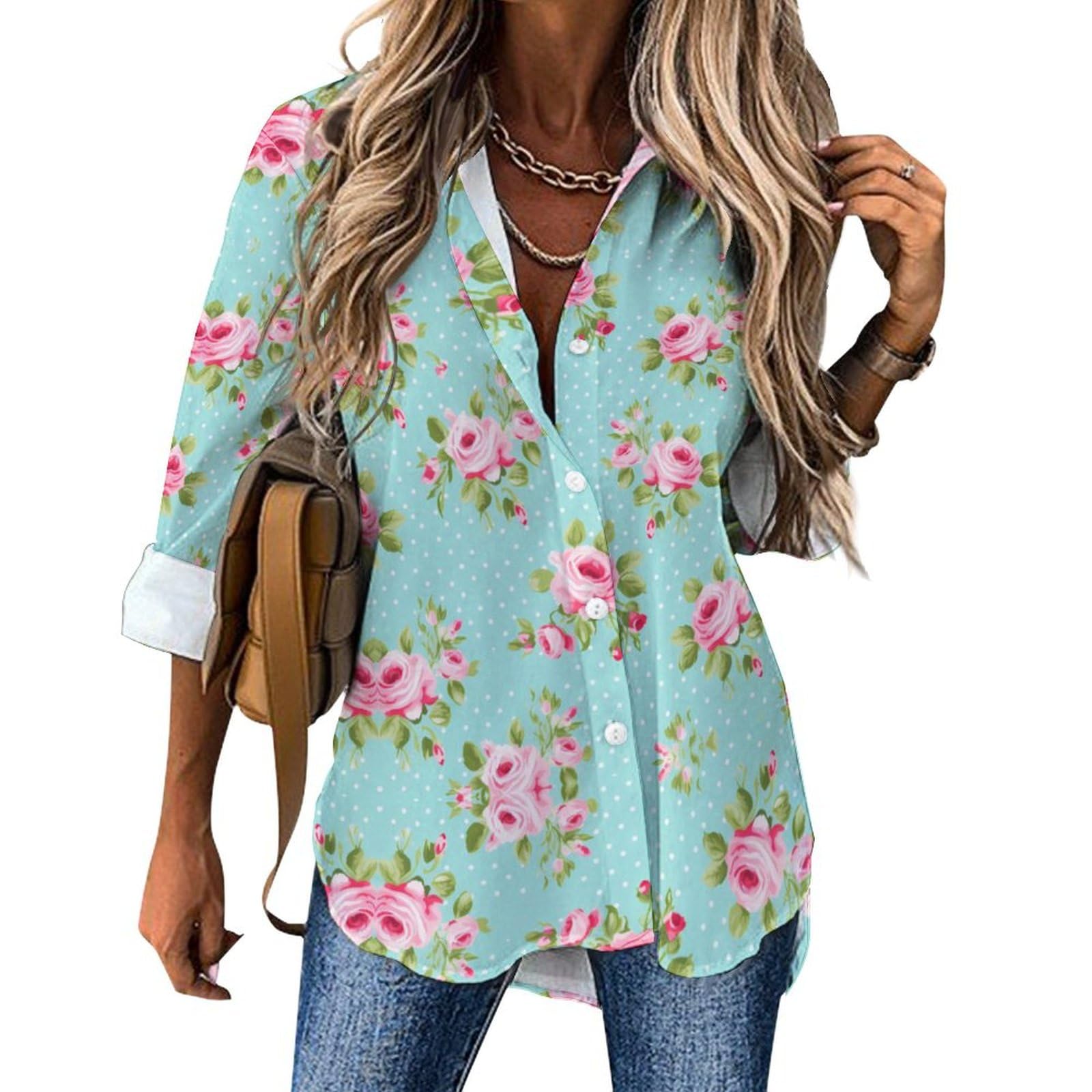 Rose Flowers Women's Button Down Shirts Casual Long Sleeve Blouses Tops Roll Up Sleeve Shirt