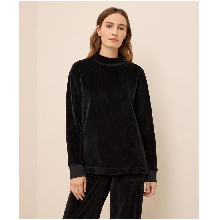 Women's Pact Organic Cotton Velour Mock Neck Pullover - Black - Sweaters Blurring the lines between ease and luxury, our Pure Velour Collection is an everyday indulgence in 100% organic cotton. Unique to Pact, this clean Velour Pullover feels soft...