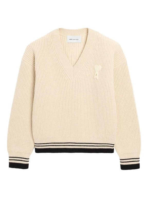 Women's AMI Ribbed Wool V Neck Ami De Coeur Sweater - Natural - Sweaters Product from a brand featuring a red heart logo with the letter A. Sweater in wool ribbed college cotton knit. Unisex productV neckHalf english ribs stitchAmi de Coeur crochet...