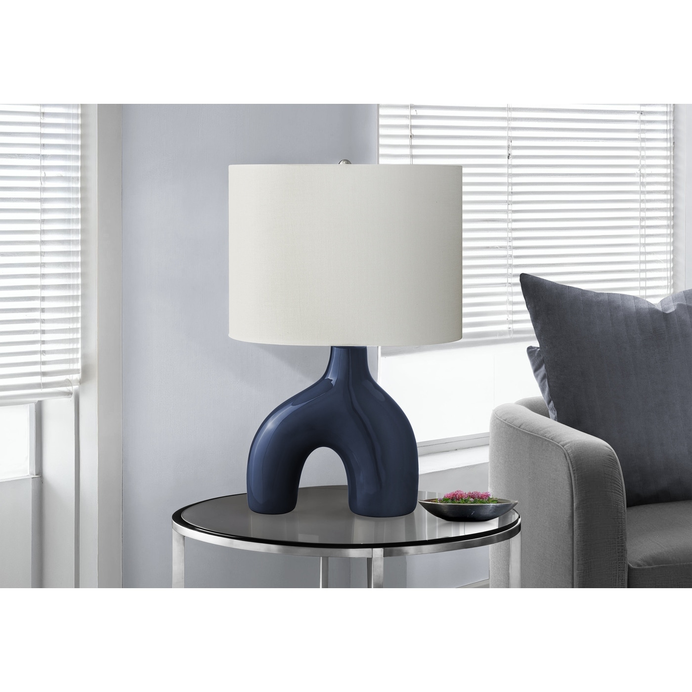 A contemporary and stylish 25"H table lamp featuring a unique two-leg shape blue ceramic base, topped with a classic ivory fabric shade and a round silver metal finial.
