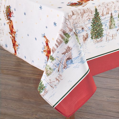 Santa Claus flies high in the sky on Christmas Eve in his Winter Sleigh. These fashionable, tailored polyester table linens feature Santa Claus and reindeer taking off from a snowy village as snowflakes fall. Colors include red, gold, blue, green,...