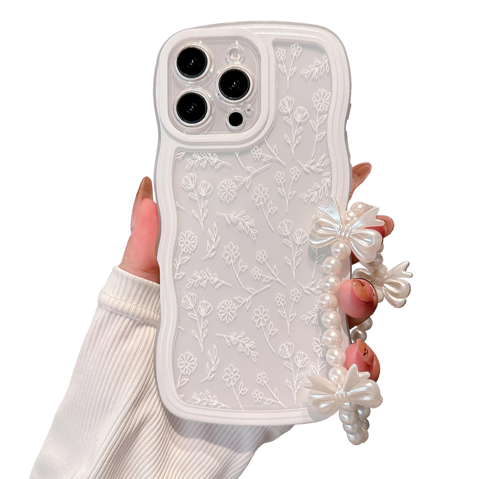 rozouai Compatible for iPhone 14 Case for Women Girls,Cute White Flowers Pattern Curly Wave Wavy Frame Shape Shockproof Soft with Bowknot Bracelet