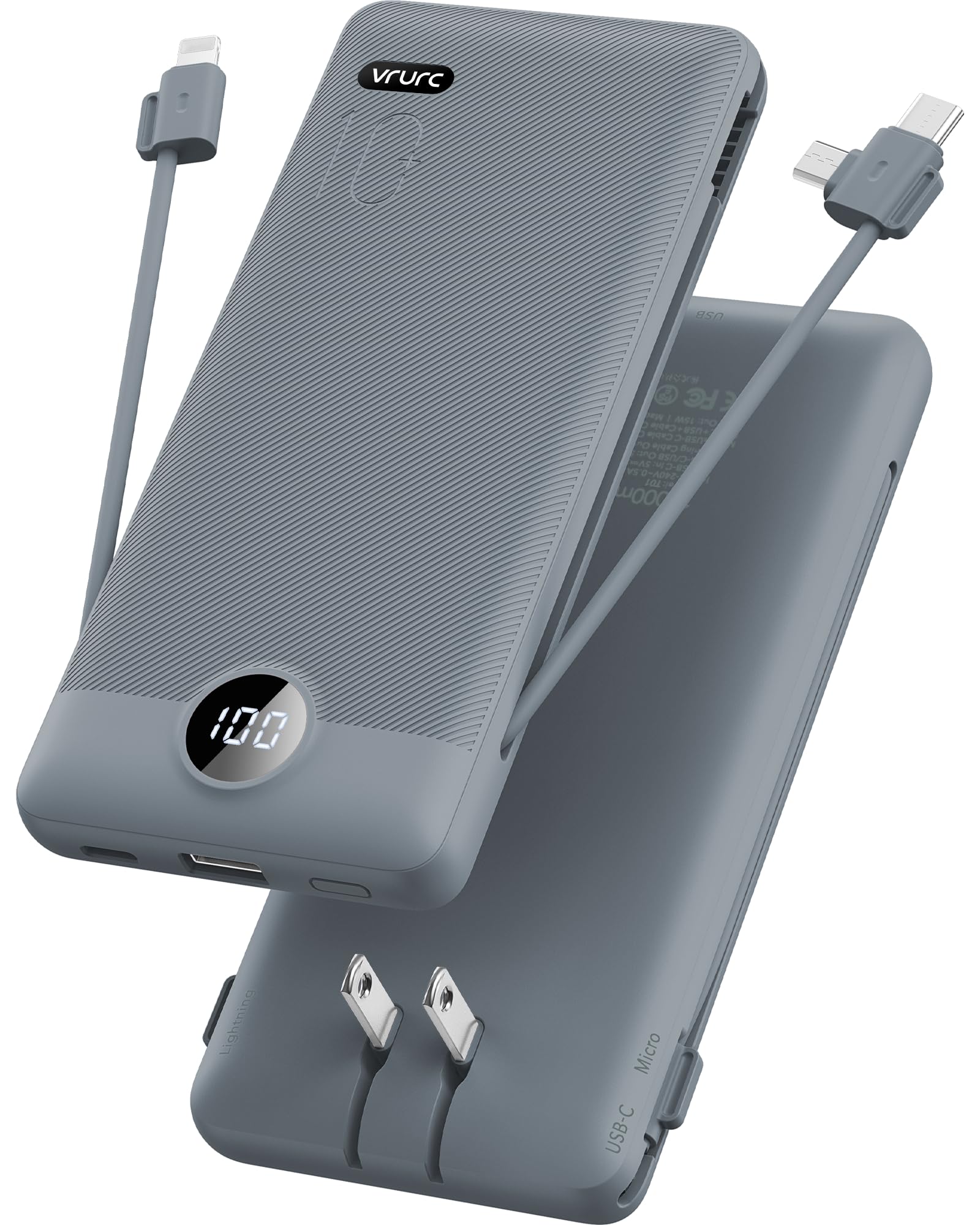 VRURC Portable Charger Built-in Cables and AC Wall Plug, USB C Power Bank 10000mAh, Travel Battery Portable Phone Charger Compact Lightweight External