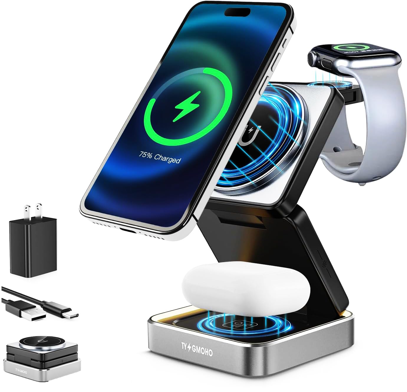 Portable 3 in1 Magsafe Wireless Charger Station for Apple iPhone, Multiple Devices, Foldable Travel Charging Stations, Magnetic Fast Charger with
