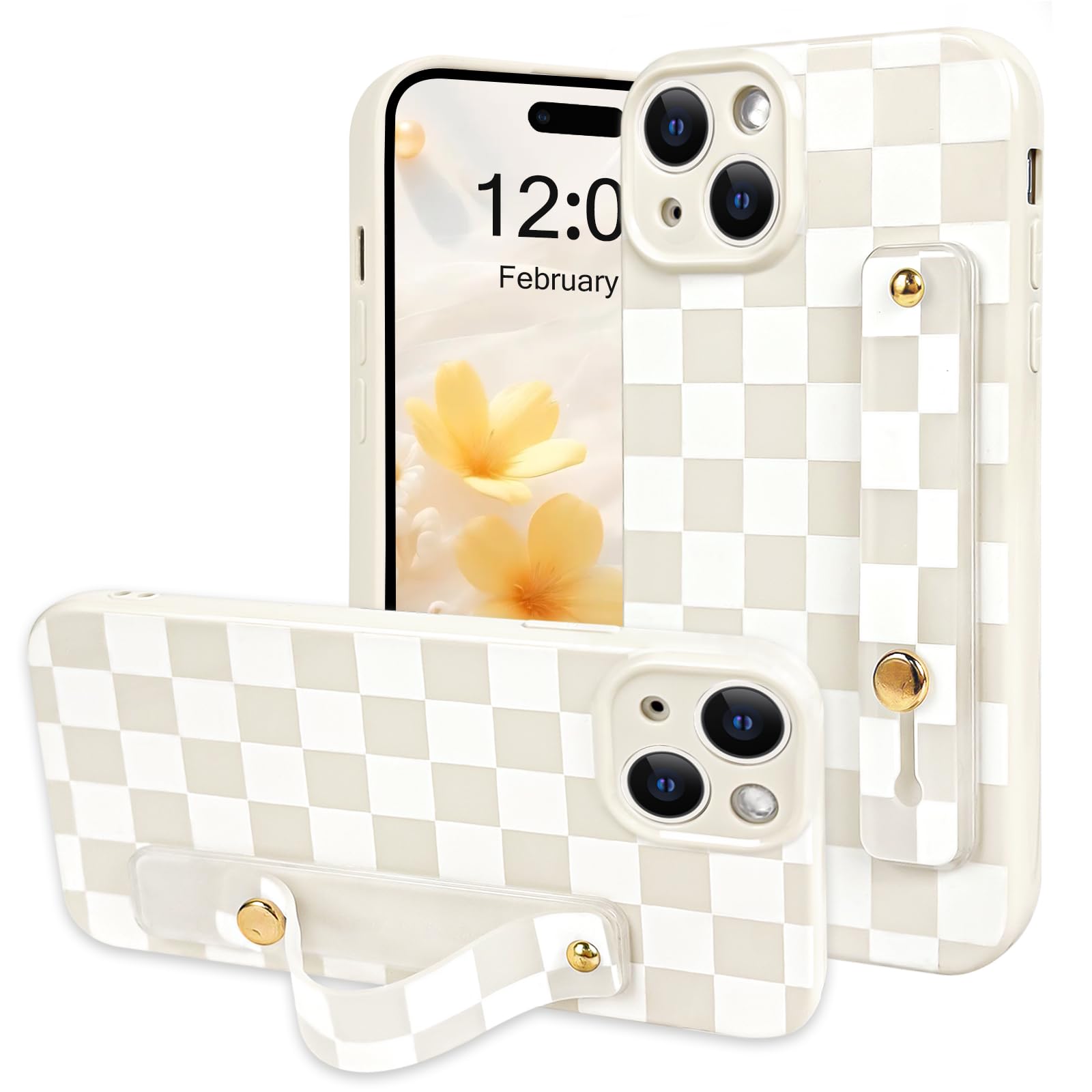 NITITOP Compatible with iPhone 15 Case with Wrist Strap Kickstand Cute Trendy Checkerboard Plaid for Women Girls Slim Fit TPU Silicone Shockproof Full