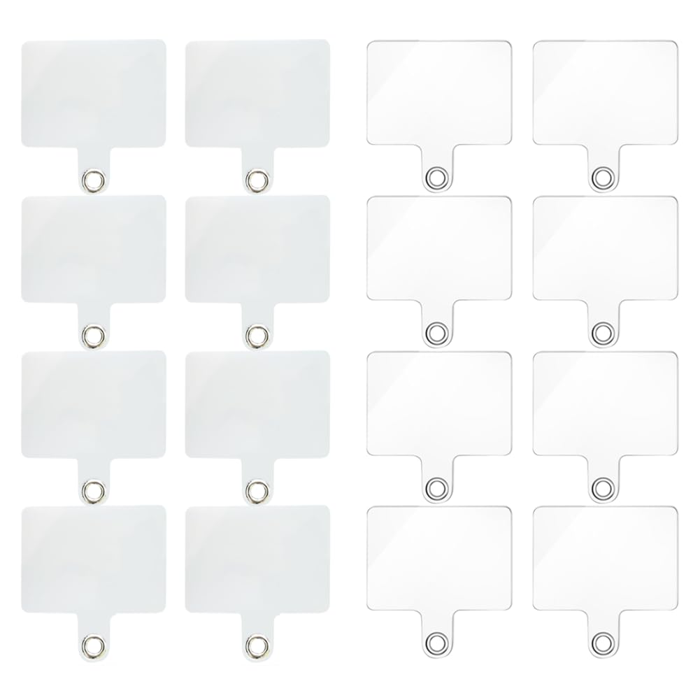 16 Pack Cell Phone Lanyard Tether Tab with Metal Ring, Universal Replacement Attachment Cellphone Tether PVC Patches Sticker Pad for Wrist Phone Strap Smartphone Neck Safety Tether, White&Transparent Specifications: Material: Premium PVC, metal. Color: White Size: about 2.1 x 1.5 inches Hole Inner D
