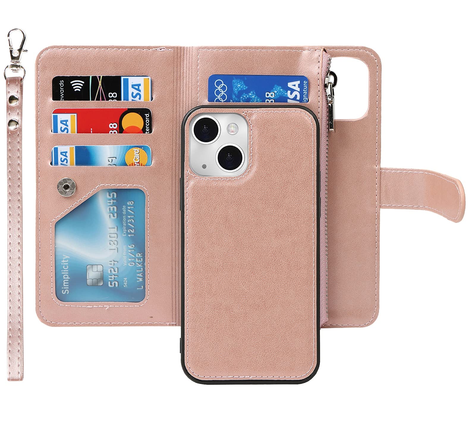 iCoverCase Compatible with iPhone 13 Wallet Phone Case with Card Holder, PU Leather Zipper Pocket Magnetic Detachable Flip Case with Wrist Strap (Rose