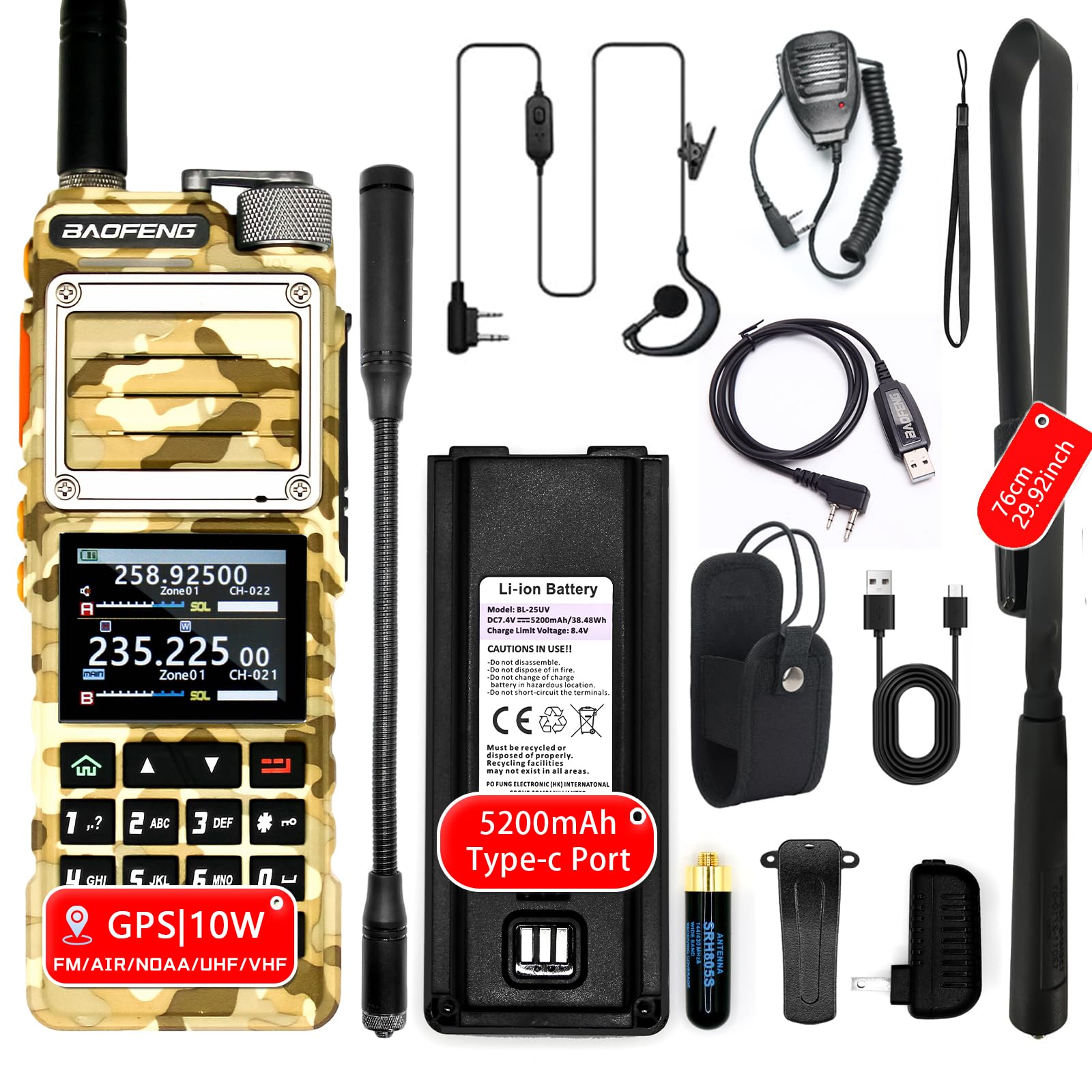 BAOFENG UV-25 PRO 10W Heavy Duty Radio Handheld Tri Band Baofeng Waterproof Radio Tri Band Ham Radios 999CH 5200MAh BatteryType-C Charging UHF VHF MW