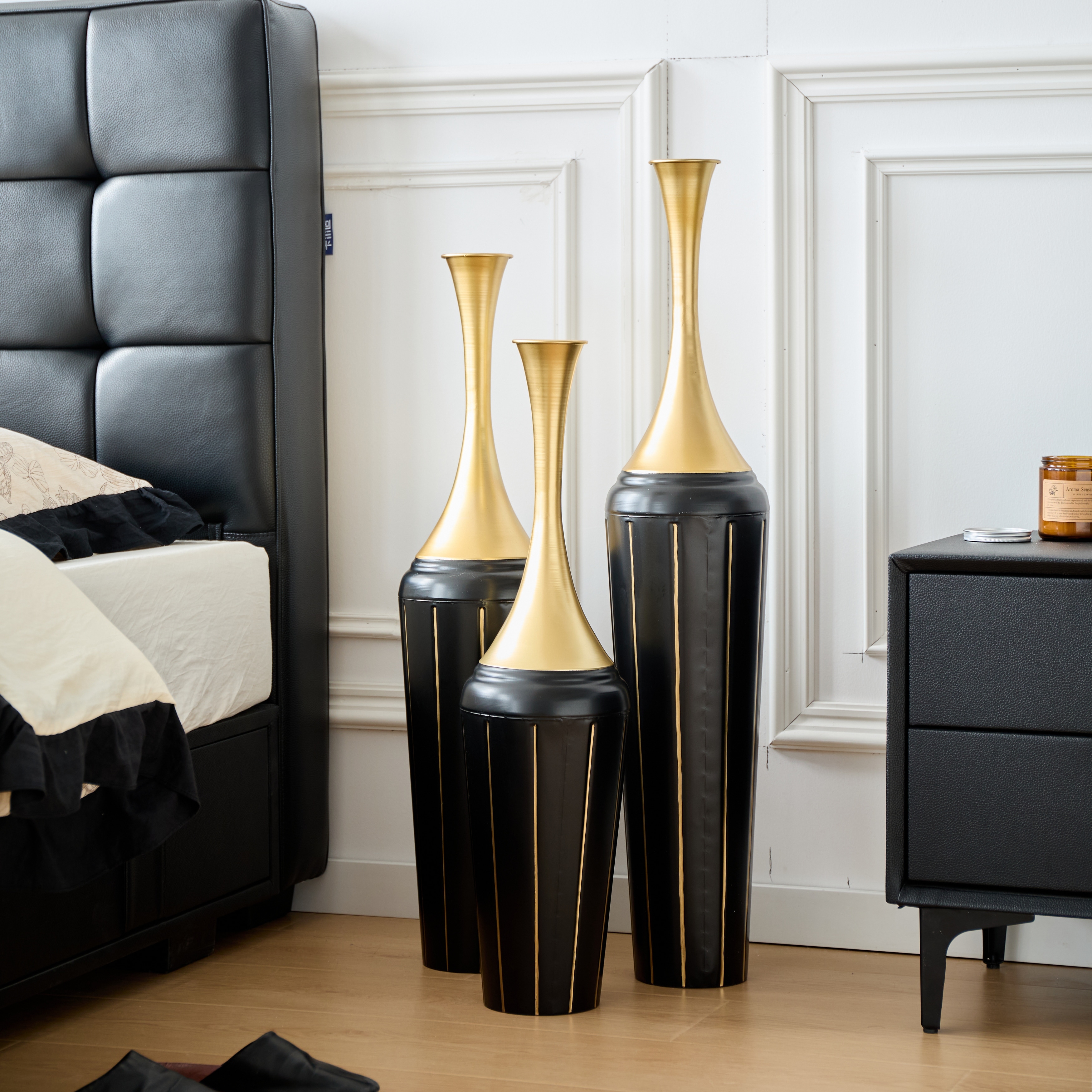 3-Piece Modern Floor Vase Set, Handcrafted Metal, 27.56" 31.5" 35.43" Tall, Black & Gold Decorative Vases for Living Room
