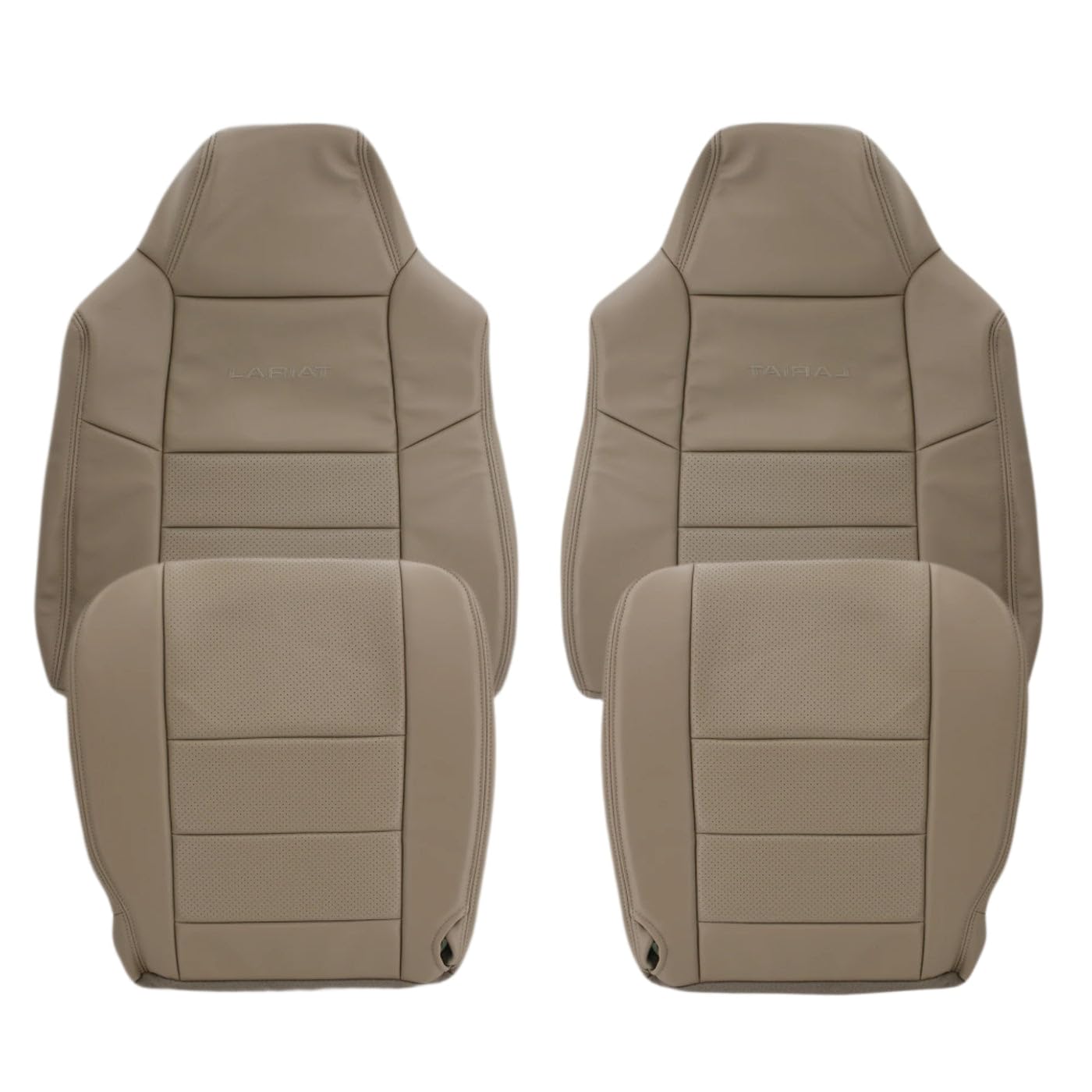 These items are a new custom-made, OEM replacement, for 2002 2003 Ford F250 F350 Lariat Leather Seat Covers Genuine Cowhide Leather in Medium Parchment Tan - with LARIAT Logo Embroidered Fits: Heated & Non-Heated Seats - Will NOT Fit: Extended Cab. Cushion Foam is NOT included. Proudly Made in USA (